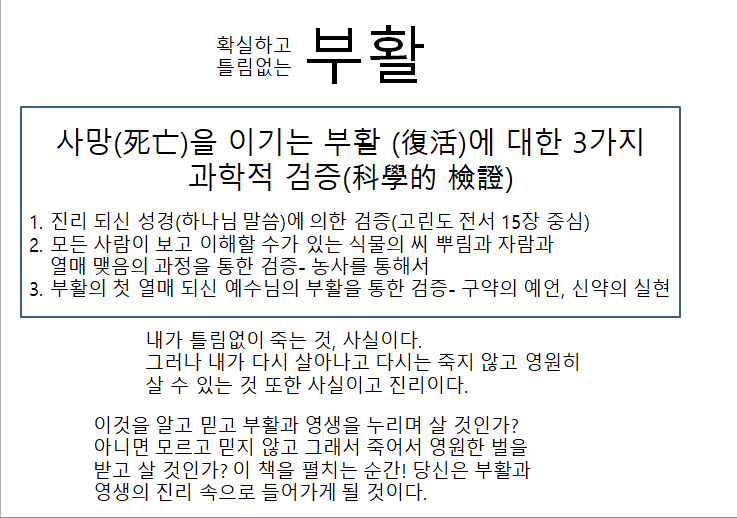 このように復活の冊子は、人間が罪を犯したこと、そして今のように生きることになったこと、そしてイエスの働きを説明します。 そして農業作る過程の説明を通して、植物の復活の証拠を関連聖書の節とともに非常に詳細に科学的に証明します。 これを通して人間の復活が確実であることを明らかにします。 確かに、植物の復活のように人間の復活も本当に自然なものです。