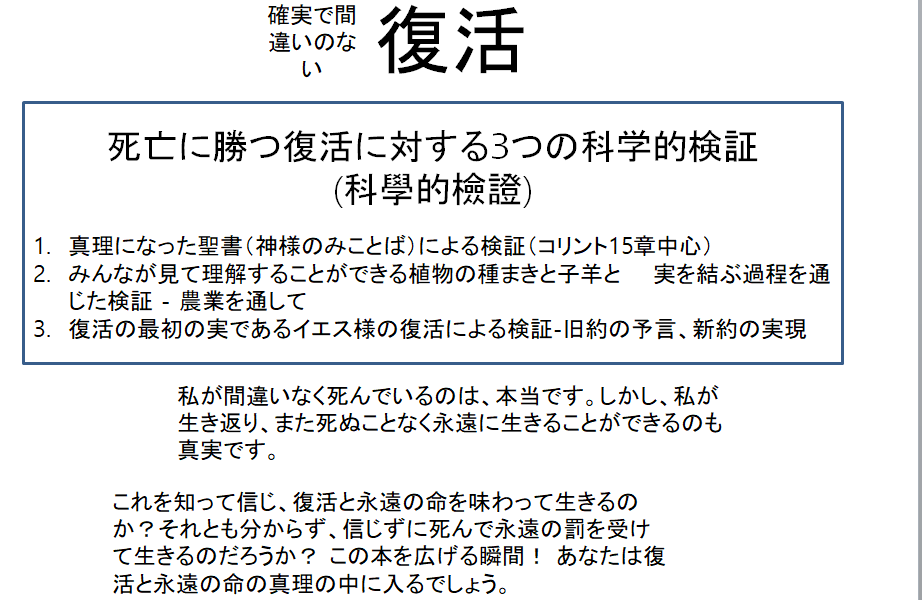 そしてまだイエス様を信じていないすべての方は、この復活の冊子をよく読んで、科学的に検証された復活を信じて、イエス様を受け入れてください。 速やかに復活の隊列に参加し、真の平安を味わうことを祈ります。