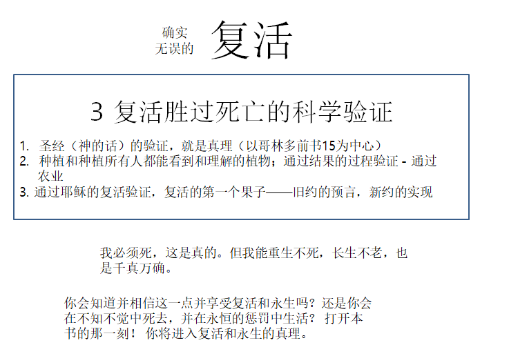 还没有相信耶稣的人,请仔细阅读这本复活小册子,相信经过科学证实的复活,接受耶稣。 祈愿你们早日加入复活的行列,享受真正的平安。