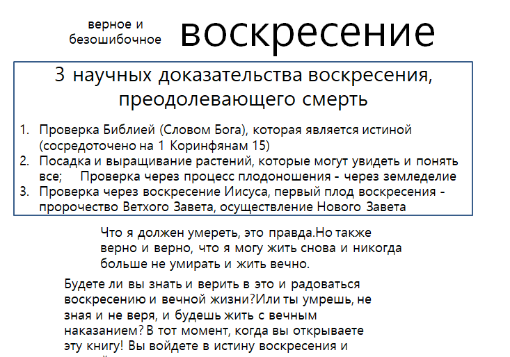 Первым испытанием достоверности воскресения является наука наук, свидетельство Библии. Теория эволюции, которую обманывает весь мир, многими считается истинной и преподается в школах, но на самом деле это ложь. Творение, записанное в Библии, очень точное и научное. Однако эволюционная теория начинается с предположений о фактах, которых не было сотни тысяч или миллионы лет назад, и выдает их за факты.