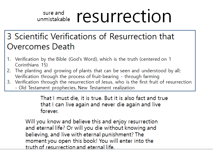 In this way, the resurrection booklet explains how humans sinned, how they came to live as they do now, and the ministry of Jesus. And through the explanation of the farming process, the evidence of the resurrection of plants is scientifically proven in great detail with related Bible verses. Through this, it is revealed that the resurrection of human beings is certain. Truly, human resurrection is as natural as plant resurrection.