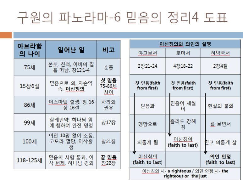 위의 도표는 성경을 읽고 정리하는 가운데 구원에 대해서 하나님께서 이해하게 하셔서 구원의 파노라마라는 내용으로 정리를 한 내용입니다. 우리가 오직 믿음 하고 끝나지만 그 믿음이 과연 어떤 믿음인지 아브라함과 하박국과 야고보서의 내용을 보면서 확인을 한 것입니다. 오직 믿음의 교리는 이신칭의로 로마서 1장 17절에 있습니다. 그런데 1장 17절은 바울 사도가 성령의 감동으로 처음 사용한 말씀이 아니라 구약의 예언서 하박국서의 2장 4절의 내용을 그대로 옮겨 온 것입니다. 그래서 당연히 하박국서 2장 4절의 내용을 참고를 해야 합니다. 하바국서에 가서 정확한 내용을 이해를 해야 합니다. 그리고 아브라함의 믿음에 대해서 4장에서 75-85세 무렵과 100세 무렵을 4장 1-16절에서 그리고 4장 17-22절에서 잘라서 설명하는데 이를 정리한 것입니다. 그리고 야고보서의 110세 무렵도 정리를 했습니다. 그래서 그 믿음이 시간이 가도 한결같아야 하고 변치 않는 믿음이 되어야 함을 보았습니다. 그리고 믿음을 갖고 반드시 의롭게 살아야 되는 믿음임도 보았습니다. 제가 알기로 루터는 너무나 성급하게 천주교와 다른 교리를 만드느라고 절대로 이렇게 저와 같이 로마서의 내용을 살피지 않았으리라 믿습니다. 만약에 그가 로마서 1장 17절은 총칙이고 이를 4장과 7장과 13장과 3장 그리고 14장에서 풀어서 설명한 것을 이해를 했다면 이를 반드시 설명을 했을 것이고 우리는 500년을 절대로 천주교와 다툴 일이 없었을 것입니다. 이제 모든 루터 전문가는 그의 로마서의 이해와 저의 이해를 비교해 보시기 바랍니다. 그리고 우리는 반드시 아브라함의 여정에 관한 창세기 내용을 이해를 해야 또 되는 것입니다. 이를 종합적으로 어느 정도 이해를 하고 위의 도표로 정리를 한 것입니다. 오직 믿음의 교리 안에 위와 같은 내용과 아래에 제가 소개하는 내용들이 다 포함이 되어 있으며 이를 다 연결을 시켜야 되는 부분이 있습니다.