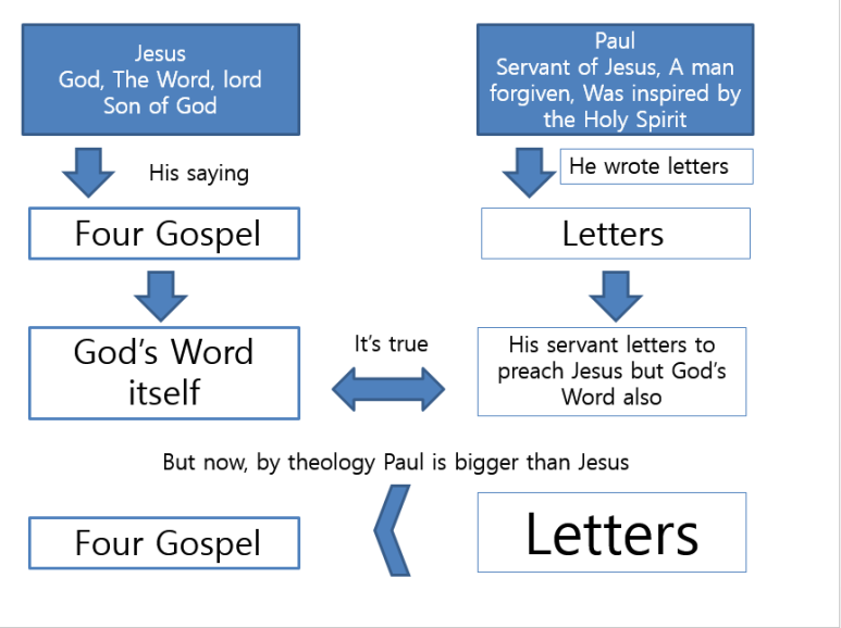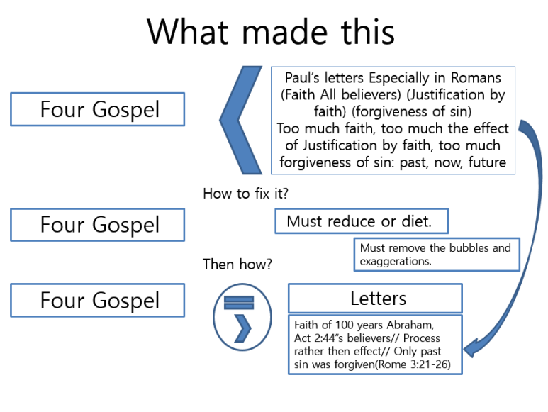 바울 사도는 2000년 전에 로마서를 기록할 때 이런 내용을 너무나 정확하게 이해하고 있었습니다. 왜 그렇습니까? 성령을 받고 성령의 인도로 복음을 전했기 때문입니다. 그리고 의롭게 됨에 있어서 이렇게 기록을 한 것입니다. 저도 경험적으로 성령을 받고 전도하고 성경을 읽고 정리하는 가운데 약 17년 이상이 경과 되었을 때 하나님께서 저를 의롭다 하는 것을 느낄 수가 있어서 처음 도표와 같이 이해하고 전한 것입니다. 그리고 로마서 1장 17절의 본문의 의미에 모든 답이 있는 것을 보고서 이렇게 전하게 된 것입니다. 시간이 적어도 20년 이상은 걸린 이해입니다. 제가 게으르고 목이 곧고 그리고 고집이 세어서 그렇게 걸린 것입니다. 대부분의 사람은 제 글을 읽고 바로 이해할 수도 있습니다. 교수님! 저를 인도하신 하나님께서 늘 저를 격려하셨습니다. 쉬지 않고 반복하셨습니다. 그래도 제가 무지하고 게을러서 하나님의 뜻을 잘 받들지 못했습니다. 빨리 깨닫지도 못했습니다. 느리게 느리게 제가 너무나 무심해서 이렇게 시간이 걸렸지만 교수님이나 다른 성도는 오늘 바로 이해하고 믿고 행할 수가 있습니다.