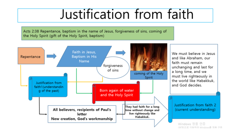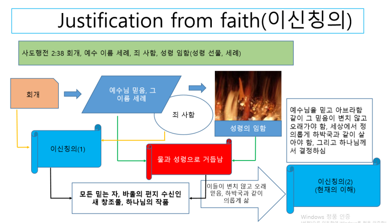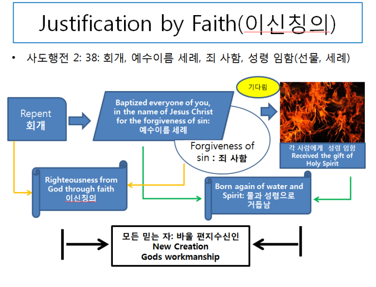가장 먼저 하나님께서는 제게 믿음으로 의롭게 된다는 교리에 대해서 경험적으로 아래와 같이 이해하게 하셨습니다. 저는 개신교의 오직 믿음의 교리에 대해서 처음부터 잘 믿지 않았습니다. 죄를 짓고 회개하면 바로 용서가 된다라는 교리가 마음에 들지 않았기 때문입니다. 그런데 의롭게 되는 과정을 알게 하시고 이를 정리하게 하시고 여의도 순복음 교회 간증문 모집에도 보내게 하셨습니다. 그 내용을 도표로 보여드립니다. 성령으로 거듭남은 너무나 중요한 부분입니다. 로마서의 수신자는 당시에 거의 모든 분이 예수님을 믿고 회개하고 그분의 이름의 세례를 받고 성령을 받은 분들이었습니다. 바울 사도는 그렇기 때문에 성령의 첫 열매인 우리라고 하고 성령으로 시작해서 육으로 끝내려고 하느냐 책망도 하는 것입니다. 이 내용을 잘 확인하고 우리도 예수를 믿고 반드시 회개하고 그분의 이름의 세례를 받아서 성령을 선물로 받는 일이 로마서를 이해하는 일보다 먼저 행해져야 하는 것입니다. 너무나 중요한 내용입니다.