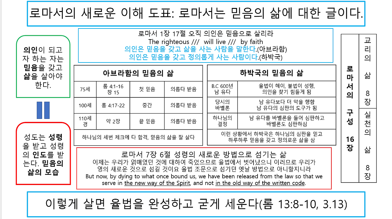 로마서는 하나님의 백성의 구원과 그 구원을 받은 백성이 성령을 받아서 성령의 도우심으로 율법을 완성하고 그 율법의 완성을 통해서 그 분의 나라, 하나님의 나라를 건설하는 내용이 순서대로 기록이 되어 있습니다. 이는 예수님의 말씀 마태복음 5장 17-20절의 말씀을 늘 염두에 두고서 로마서를 읽고 이해할 때 이 말씀의 범위 안에서 로마서를 이해할 때 가능하게 되는 일입니다. 이 말씀의 인도를 받지 않고 율법에 대해서 믿음에 대해서 마음대로 해석할 때 모두가 예수님의 말씀 마태복음 5장 17-20절의 말씀을 위배해서 천국에 가더라도 지극히 작은 자로 사는 삶을 살고, 율법을 전혀 지키지 않고 살고, 성령의 인도도 없이 자기 마음대로 살아서 그 의가 지금의 바리새인 즉 현대의 유대인만 못해서 결국은 지옥으로 가게 되는 것입니다. 이제 이 내용을 성경 본문을 차례로 보면서 맞는지 확인하겠습니다.