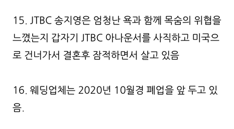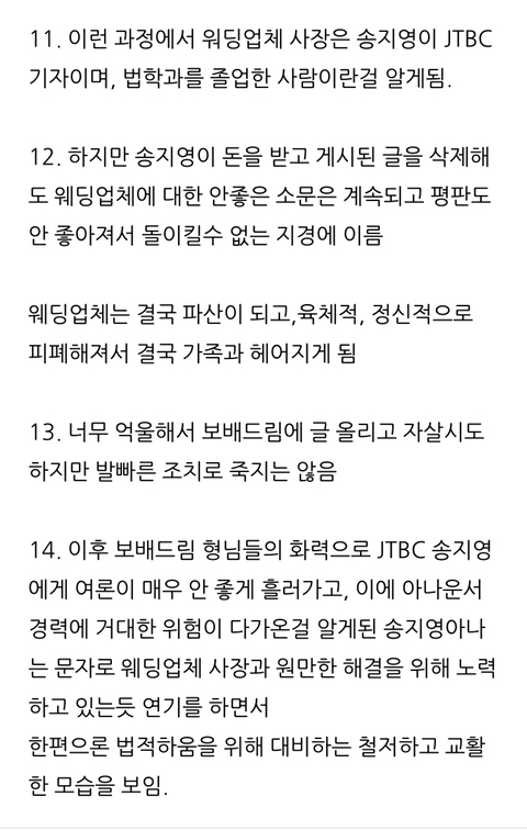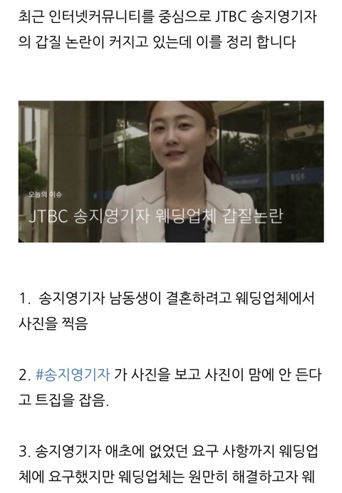 [스크랩] JTBC 송지영기자 웨딩업체 갑질 논란 정리 작성자피트|작성시간20.08.26|조회수311 목록 댓글 1 글자크기 작게가 글자크기 크게가 블로그펌 다음검색 스크랩 원문 : * 남성시대 * 남자들을 위한 휴식공간 현재 게시글 추가 기능 열기 북마크 공유하기 신고 센터로 신고 댓글 댓글 1 댓글쓰기 답글쓰기 댓글 리스트 작성자피트 작성자 본인 여부 작성자 | 작성시간 20.08.27 나쁜 년 이구만 댓글 전체보기