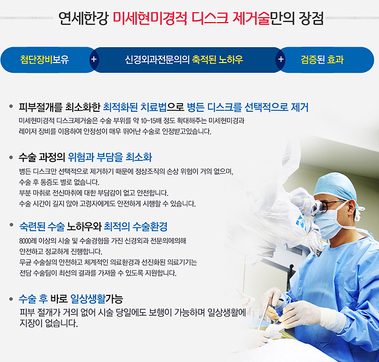 이러한 치료에도 차도가 없거나 증상이 매우 심각한 경우에는 수술적인 방식을 고려하게 되는데요, 연세한강에서는 미세 현미경을 이용한 디스크 절제술, 척추 유합술 등 다양한 수술을 진행하고 있습니다.