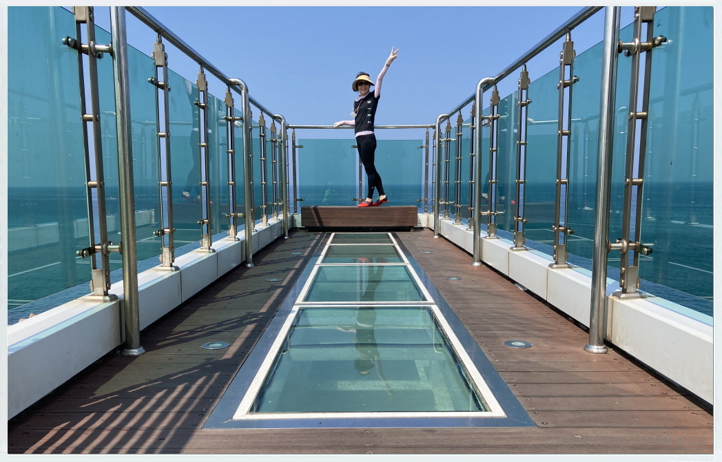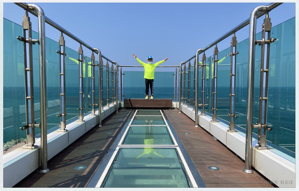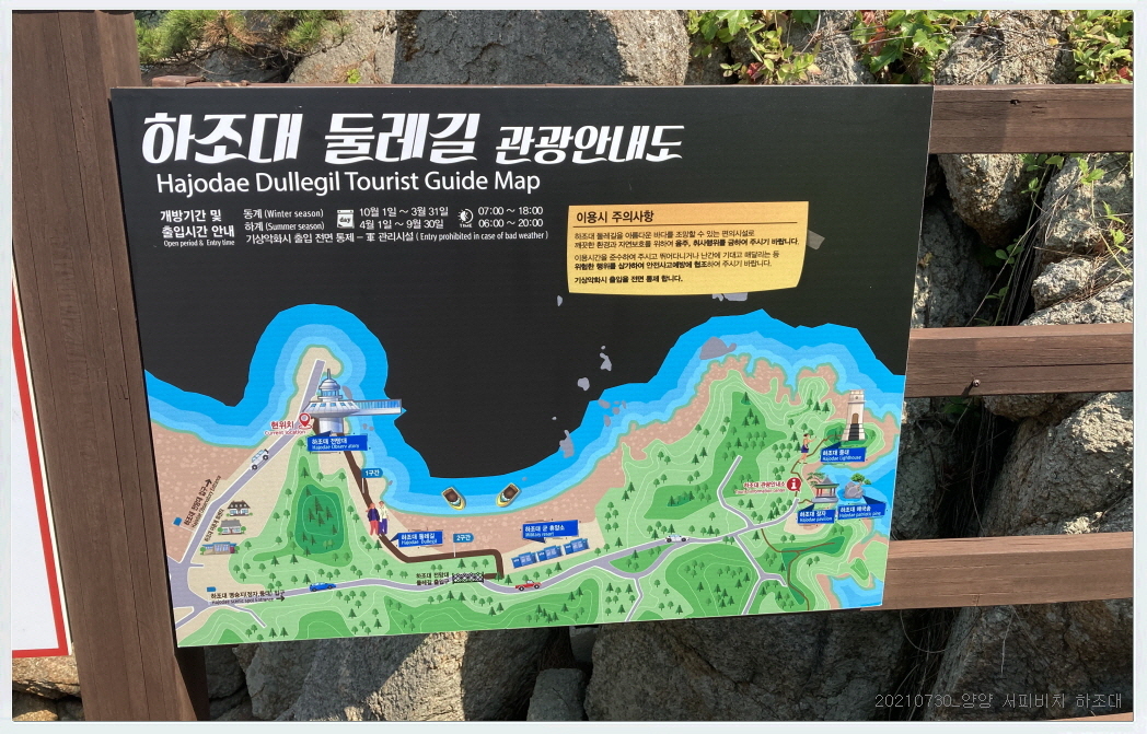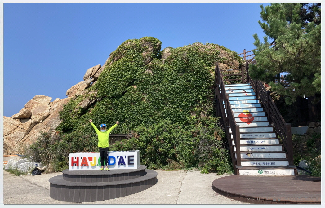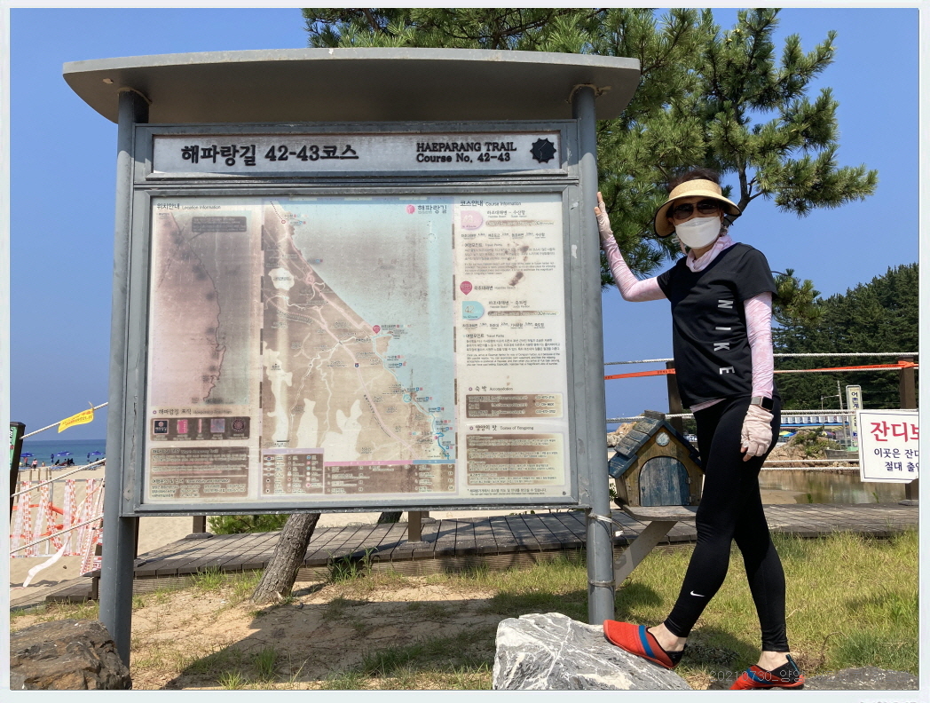 오늘 내가 걸으려 했던 해파랑길 43번 코스다. 이 코스는 하조대 해변에서 양양의 수산항까지 9.5킬로 길로 하조대해변 - (4.3km) - 여운포교 - (2.2km) - 동호해변 - (3.0km) - 수산항 입구를 말한다. 내 사진을 손자 근후에게 부탁했는데 제법 잘 찍는다. 뭐든 시키지 않아도 알아서 잘하고 뭐든 가르쳐주면 어렵지 않게 척척 잘 해낸다. 하조대 전망대 오르는 길은 근후와 나랑 둘이서 걸었다.