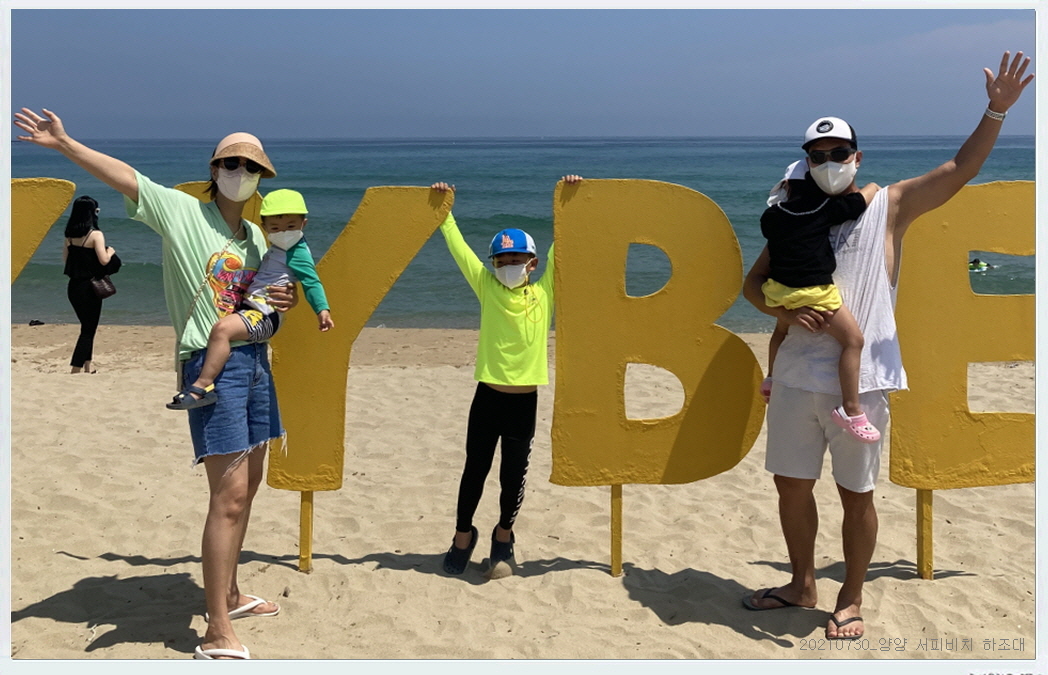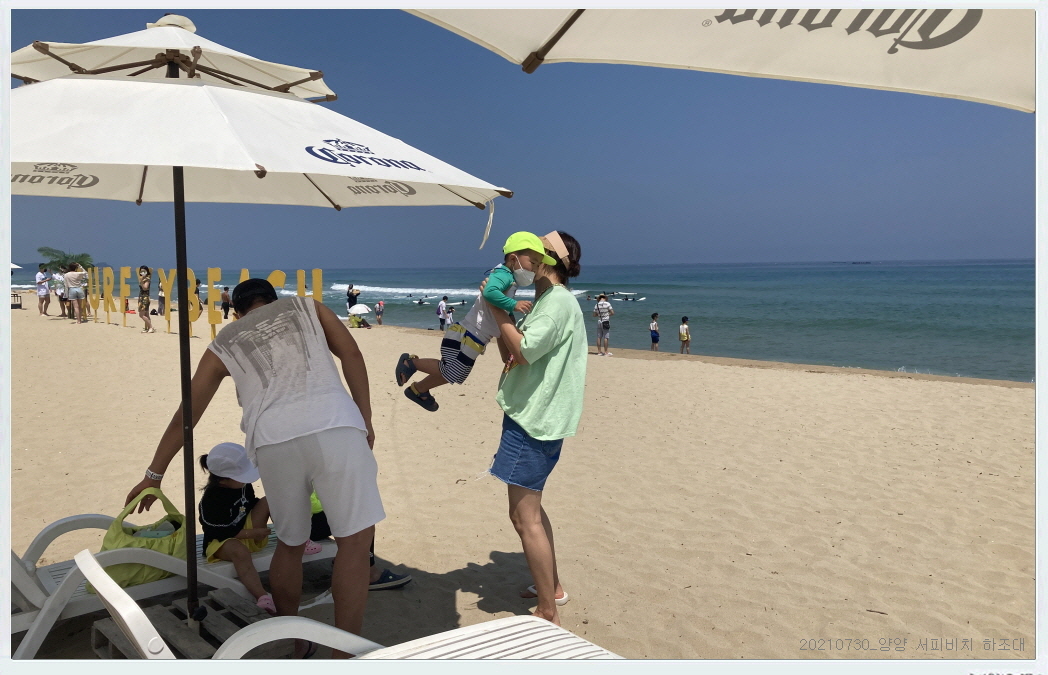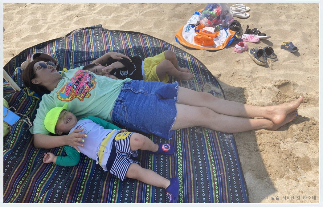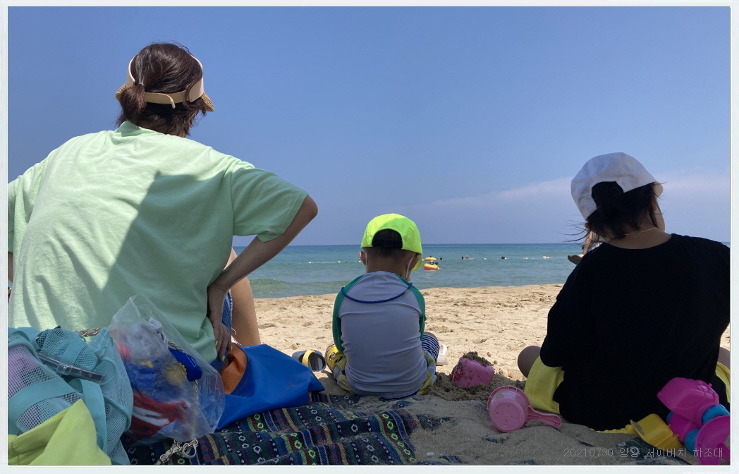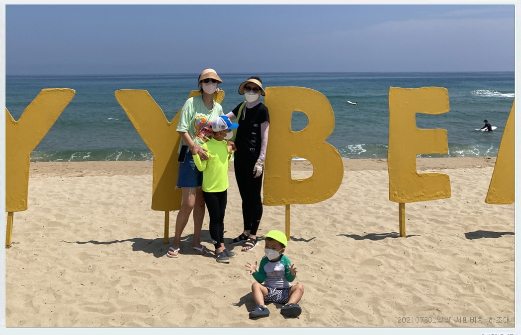 11시 체크아웃 시간에 맞춰 바리바리 짐을 챙겨 속초에서 양양비치콘도로 이동했다. 다둥이 셋과 짐들이 장난 아니게 많다. 말로 하니 쉽지, 실로 쉬운 일이 아닌데 아들 내외는 홀라당 참 잘도 한다. 동행한 어미로서 뭔가 도우려고 하지만 그다지 도울 것도 없이 참 손발이 잘 맞는 부부이고 가족이다. 고기도 먹어본 놈이 맛을 안다고 여행도 자주 다녀본 애들이라 손발이 척척 맞다. 여행 내용이 아가들을 위한 거라 오늘은 주로 해수욕과 서핑을 할 모양이다.