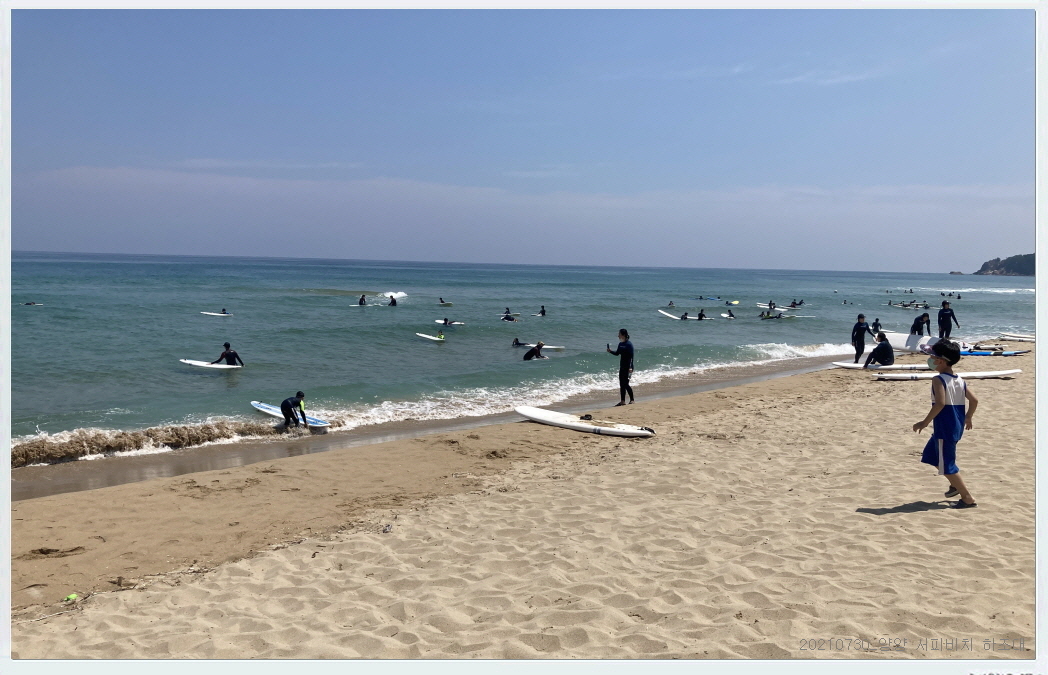 이곳 해변은 서핑하는 공간과 해수욕을 즐기는 공간이 따로 있다. 아들과 손자 근후는 서핑을 하고 싶지만 근후의 신장과 나이 조건이 맞지 않아 서핑을 배우거나 탈 수가 없다. 키가 최소 150Cm는 돼야 하는데 근후는 140이고 나이도 적어서 위험하단다. 금방 풀이 죽은 근후다. 아쉬움을 뒤로 하고 바로 옆 구간의 중광정리 해수욕장으로 이동한다.