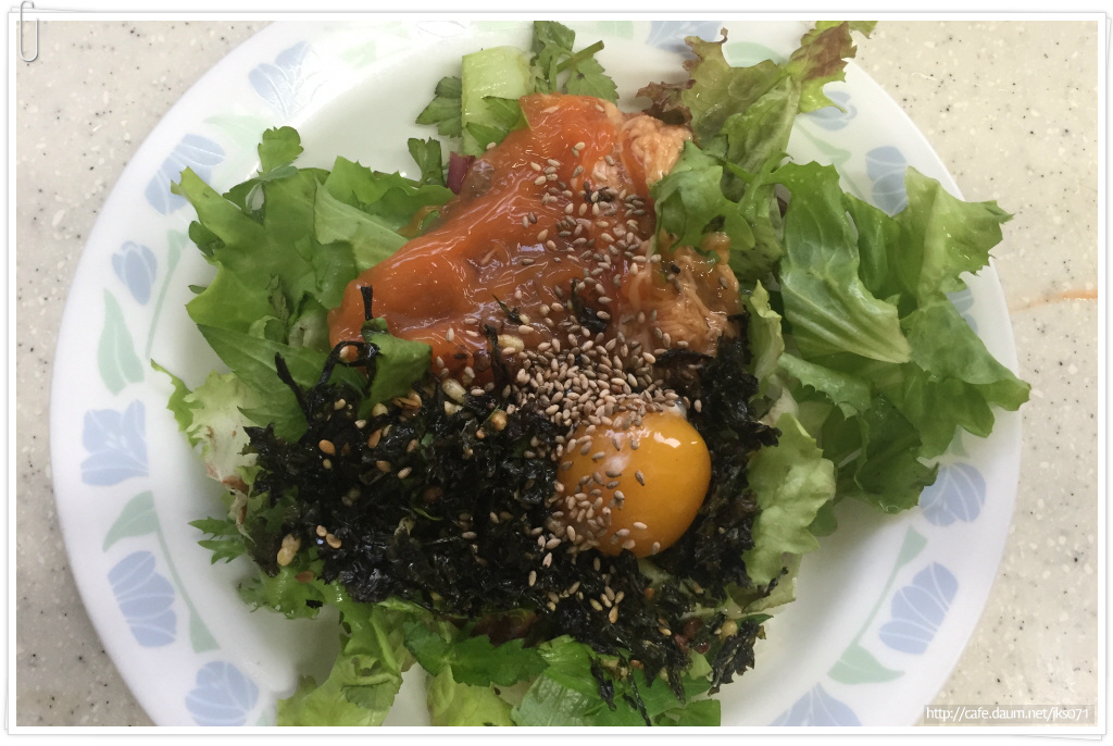 일요일 저녁 메뉴로는 석가헌 갖은 야채와 해삼내장, 그리고 김가루와 달걀노른자. 초고추장을 넣고 해삼내장비빔밥을 해 먹었다.