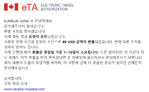 아들이 캐나다여행허가서를 받아 이중으로 만들어 졌으니 환불을 해달라는 메일을 보냈다.