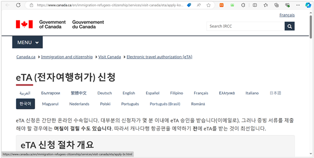 캐나다 여행 허가는 https://www.canada.ca/en/immigration-refugees-citizenship/services/visit-canada/eta/apply-ko.html에서 해야 한다.