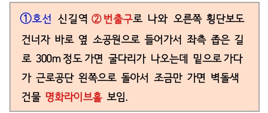 새로 단장한 명화라이브홀은 오렌지색의 밝고 아담한 모습으로 도로가에 위치해있고 건물 주위로는 넓은 공간이 없는것이 조금은 아쉬웠지만 지하에 커피숖이 있어 휴식엔 큰 지장은 없을것 같아요.