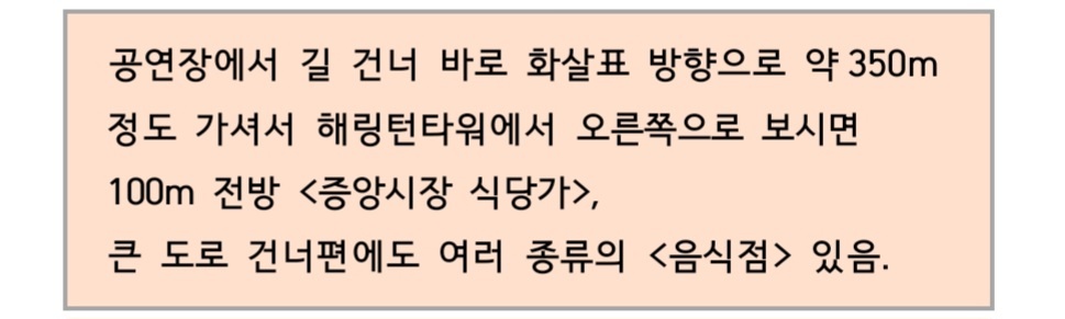 식사는 홀앞 건널목을 건너 10분쯤 걸어가시면 서울에서 유명한 영등포시장 안에 순대국골목이 있고또 길건너에도 식당골목이 있어 식사에는 큰 무리가 없다고 봅니다.