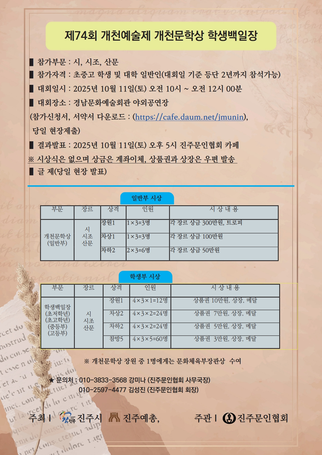 2025년 제74회 개천예술제 개천문학상 및 학생백일장 안내 작성자진주문인협회|작성시간25.09.02|조회수1,710 목록 댓글 0 글자크기 작게가 글자크기 크게가 첨부한 "참가신청서"를 미리 작성해 오면 원할한 접수가 됩니다.개천예술제 참가신청서.hwp45.00KB 첨부파일첨부된 파일이 2개 있습니다. jpg 파일 백일장_1.jpg 다운로드 hwp 파일 개천예술제 참가신청서.hwp 다운로드 다음검색 현재 게시글 추가 기능 열기 북마크 공유하기 신고 센터로 신고 댓글 댓글 0 댓글쓰기 답글쓰기 댓글 리스트