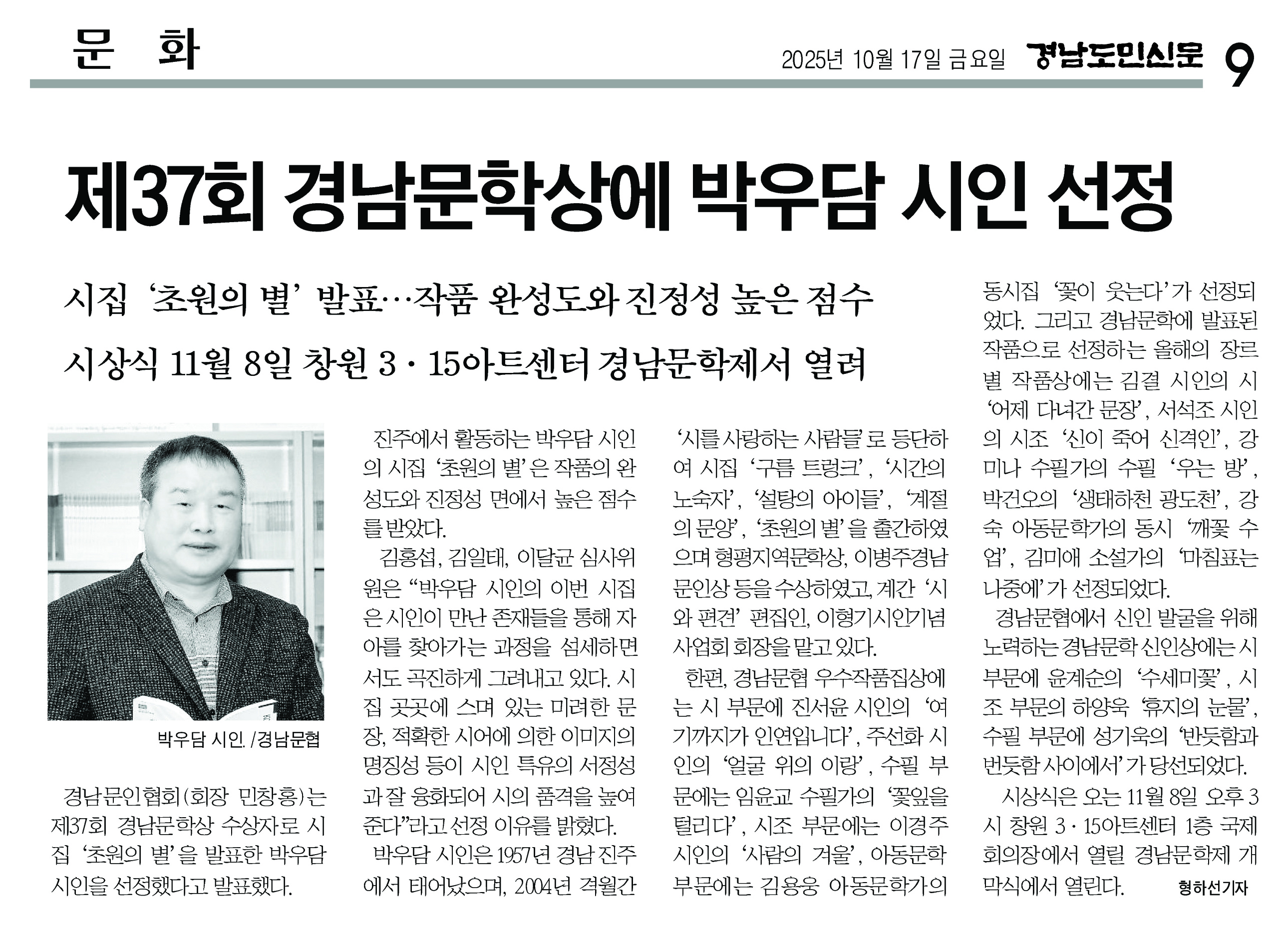 2025년 경남문학상에 박우담 시인, 우수작품상 수필 부문에 강미나... 작성자진주문인협회|작성시간25.10.17|조회수164 목록 댓글 7 글자크기 작게가 글자크기 크게가 축하합니다. 다음검색 현재 게시글 추가 기능 열기 북마크 공유하기 신고 센터로 신고 댓글 댓글 7 댓글쓰기 답글쓰기 댓글 리스트 작성자이진주 | 작성시간 25.10.22 박우담 선생님^^경님문학상 수상을 진심으로 축하드립니다~ 작성자김유경. | 작성시간 25.11.02 박우담 강미나 선생님 축하드립니다 작성자김정분 | 작성시간 25.10.24 박우담선생님 강미나 선생님 진심으로 축하드립니다 작성자허미선 | 작성시간 25.10.28 두 분 선생님, 축하드립니다~~^^ 작성자박진옥 | 작성시간 25.12.24 두분 선생님~~~진심 다해 축하드립니다~~ 댓글 전체보기