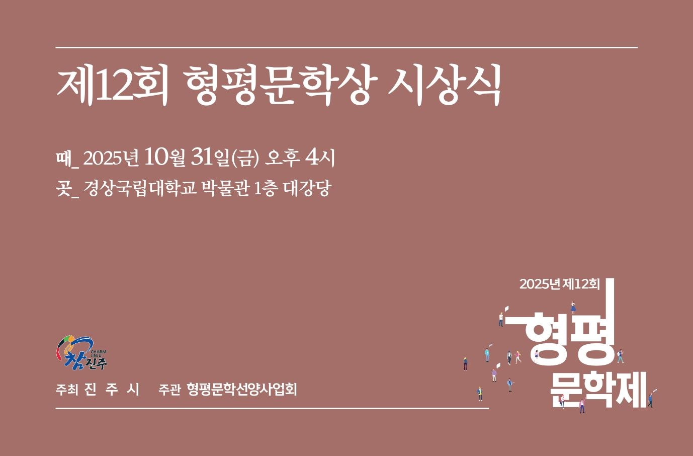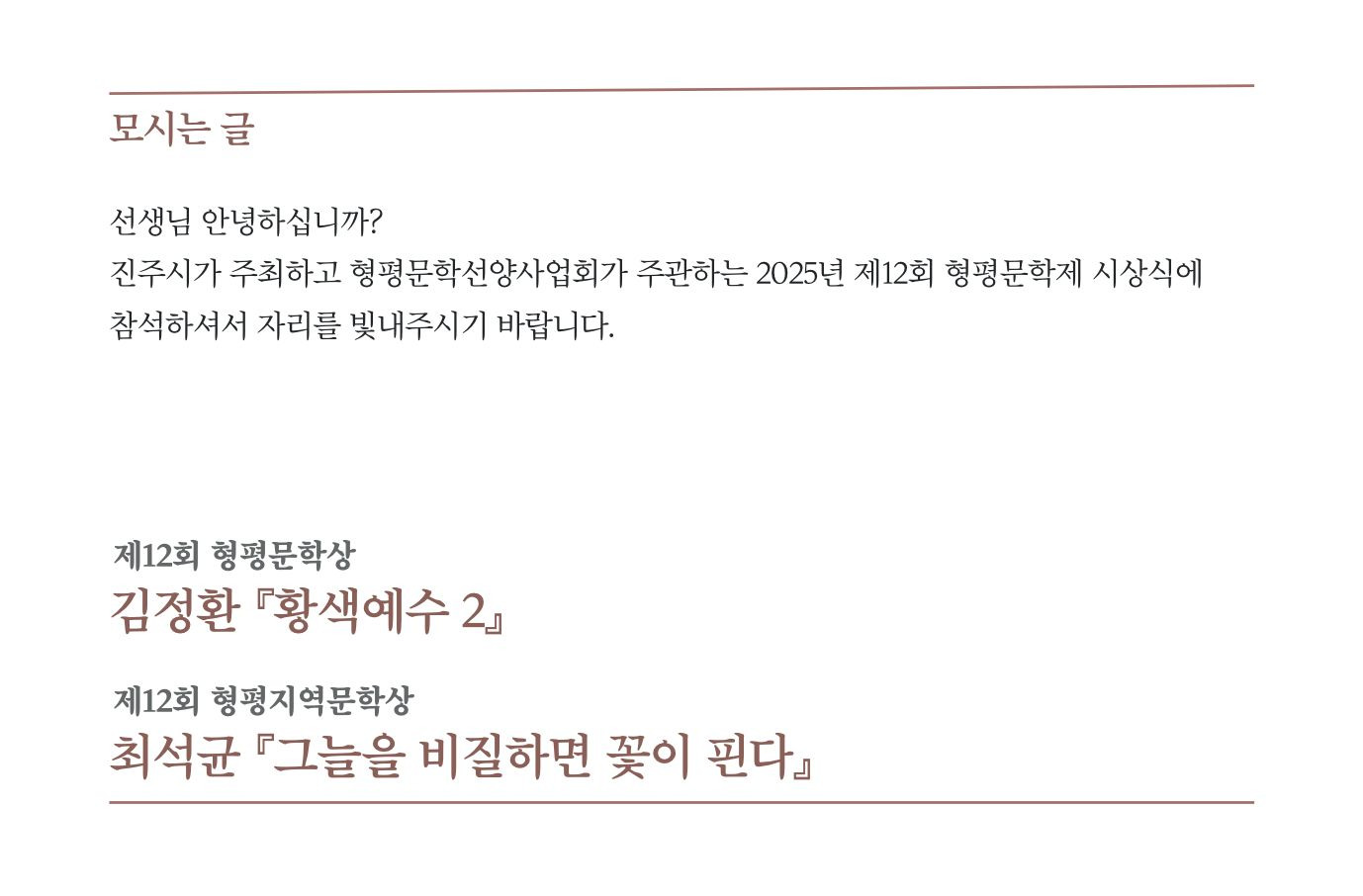 제12회 형평문학제 시상식에 초대합니다 작성자김수환|작성시간25.10.17|조회수84 목록 댓글 0 글자크기 작게가 글자크기 크게가 다음검색 현재 게시글 추가 기능 열기 북마크 공유하기 신고 센터로 신고 댓글 댓글 0 댓글쓰기 답글쓰기 댓글 리스트