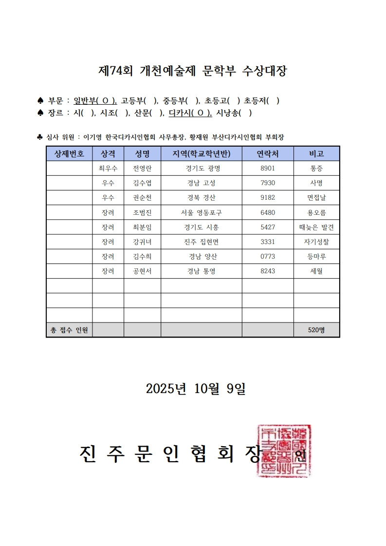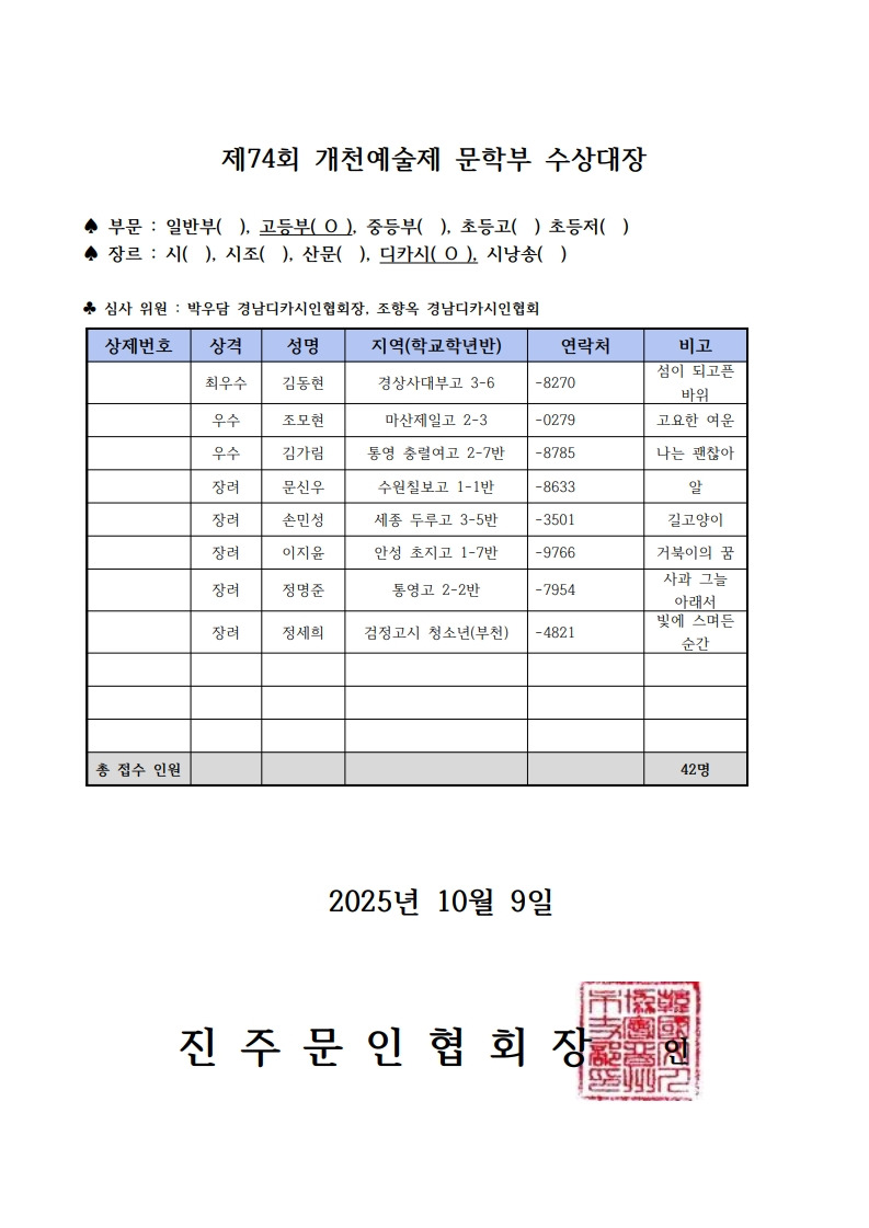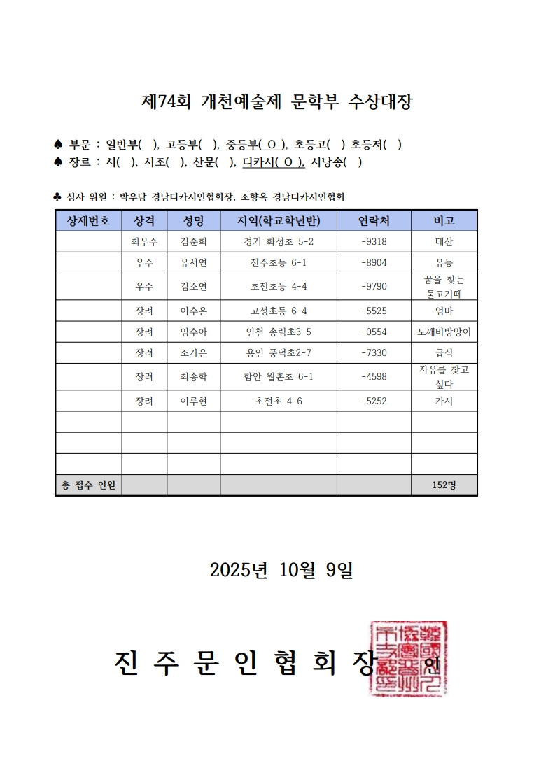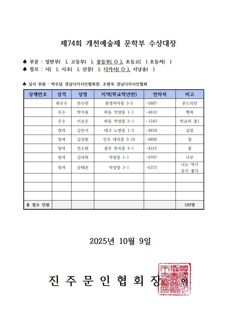 거의 전교생의 작품을 출품해 주신 하동악양중학교 담당자님께 감사드립니다.