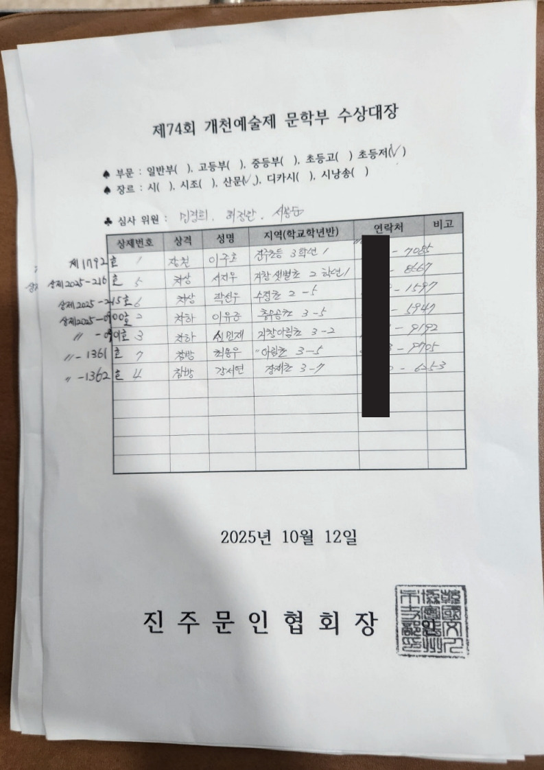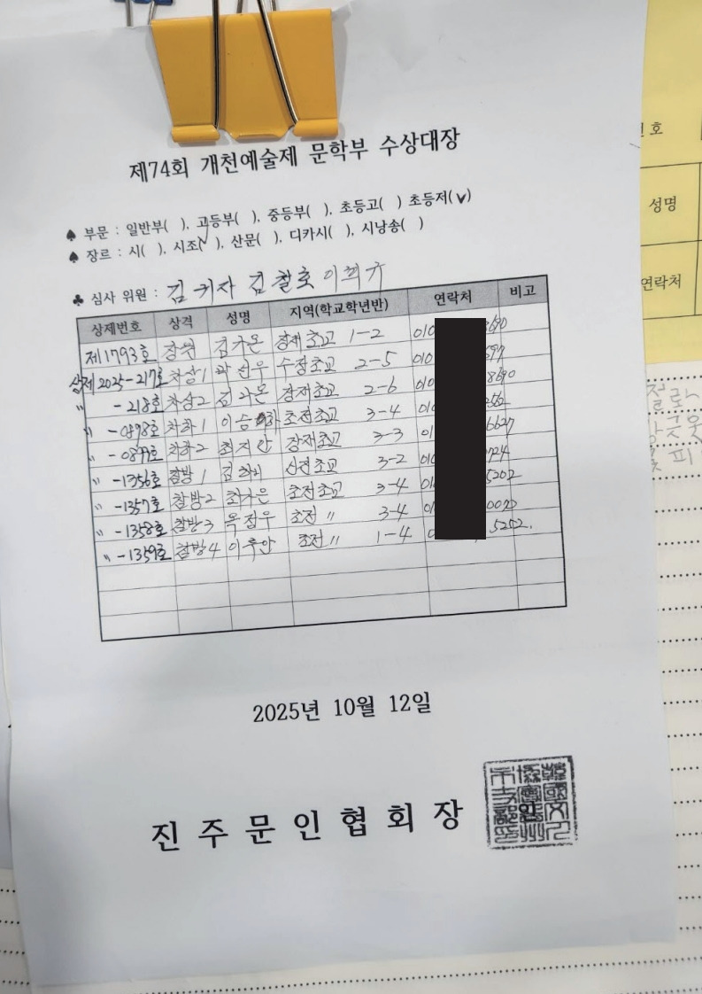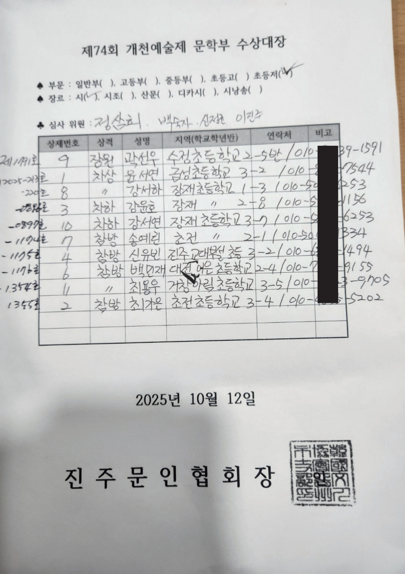 제74회 개천예술제 초등저학년 시 시조, 산문 수상자 발표 작성자진주문인협회|작성시간25.10.11|조회수501 목록 댓글 4 글자크기 작게가 글자크기 크게가 다음검색 현재 게시글 추가 기능 열기 북마크 공유하기 신고 센터로 신고 댓글 댓글 4 댓글쓰기 답글쓰기 댓글 리스트 작성자최희강 | 작성시간 25.10.11 축하드립니다^^ 작성자강미나 | 작성시간 25.10.13 제74회개천예술제 학생백일장에 수상한 초등 저학년 어린이 여러분,진심으로 축하합니다. 내년에 또 만나요! 작성자박진옥 | 작성시간 25.10.13 모두 축하드려요^^ 작성자진주문인협회 작성자 본인 여부 작성자 | 작성시간 25.10.14 초등 저학년 시 강서하를 강서아로 수정합니다. 댓글 전체보기