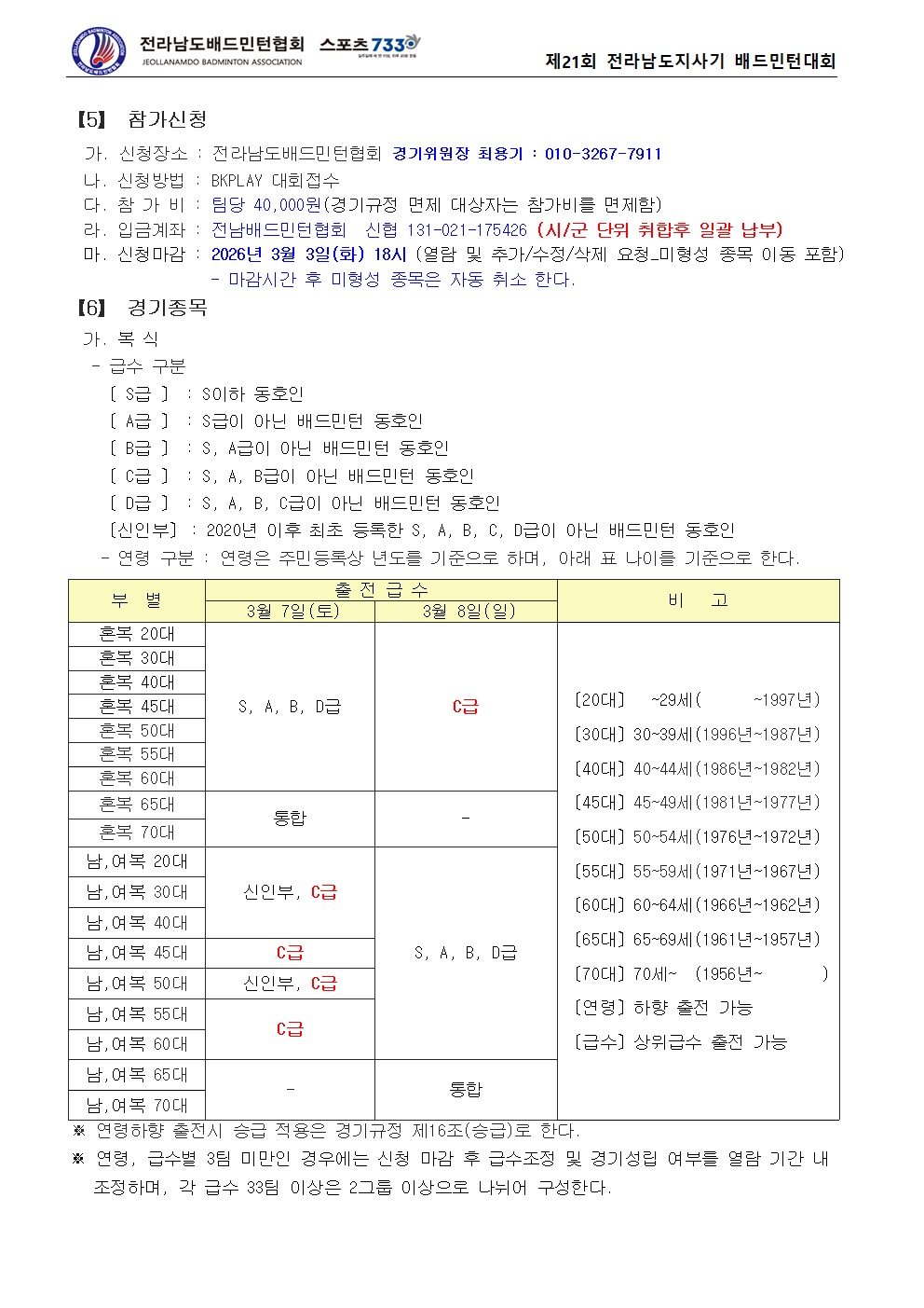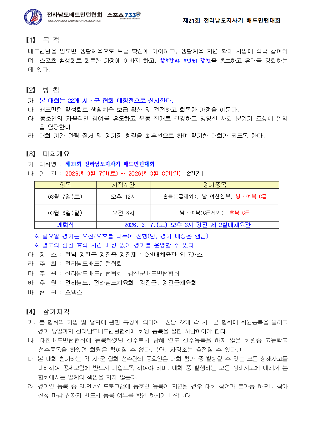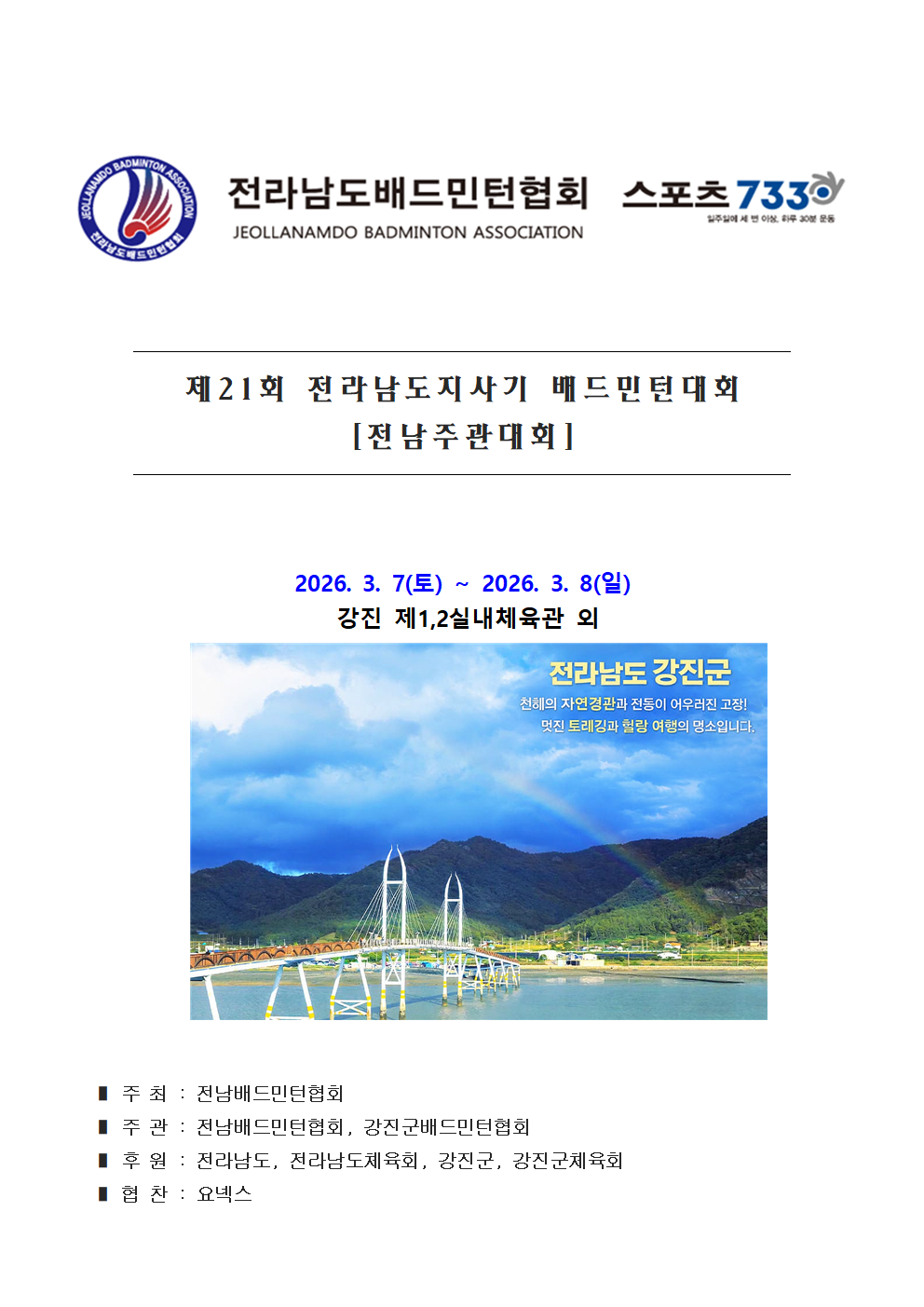 제21회 전라남도시자기 배드민턴대회 요강(3/7~8) 작성자최용기(전배협 경기위원장)|작성시간26.02.11|조회수451 목록 댓글 0 글자크기 작게가 글자크기 크게가 다음검색 현재 게시글 추가 기능 열기 북마크 신고 센터로 신고 댓글 댓글 0 댓글쓰기 답글쓰기 댓글 리스트