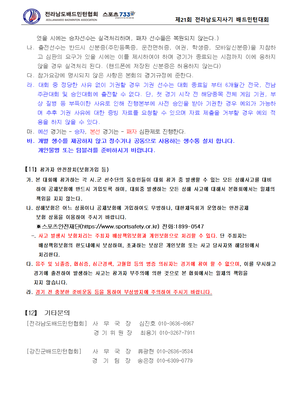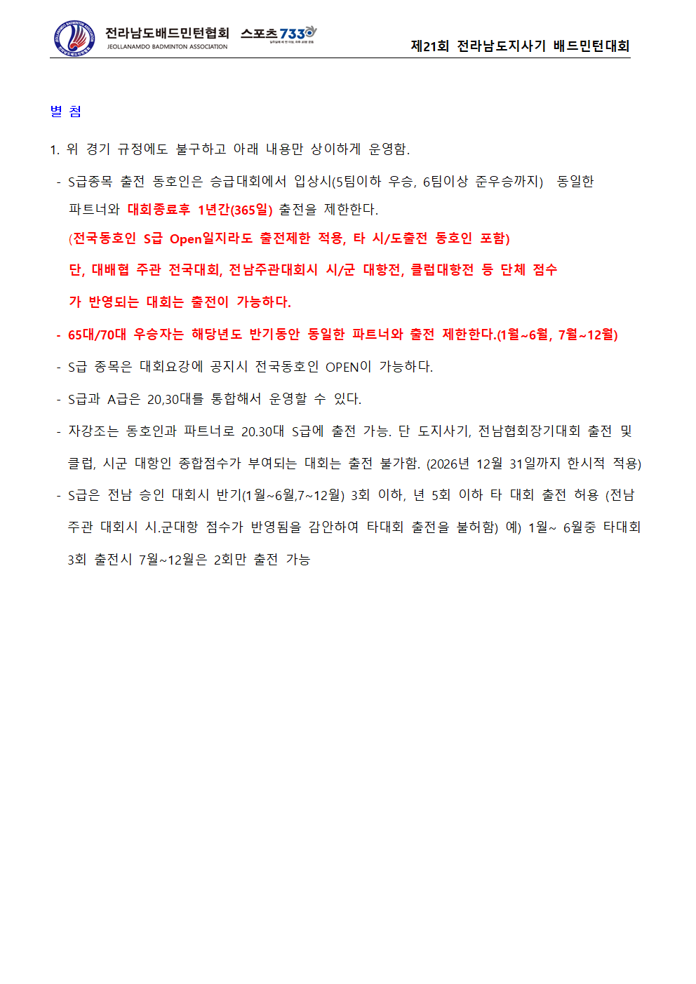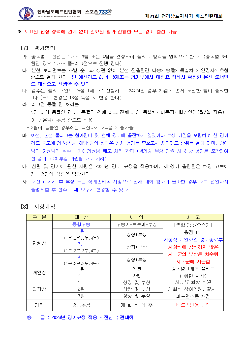 제21회 전라남도시자기 배드민턴대회 요강(3/7~8) 작성자최용기(전배협 경기위원장)|작성시간26.02.11|조회수451 목록 댓글 0 글자크기 작게가 글자크기 크게가 다음검색 현재 게시글 추가 기능 열기 북마크 신고 센터로 신고 댓글 댓글 0 댓글쓰기 답글쓰기 댓글 리스트