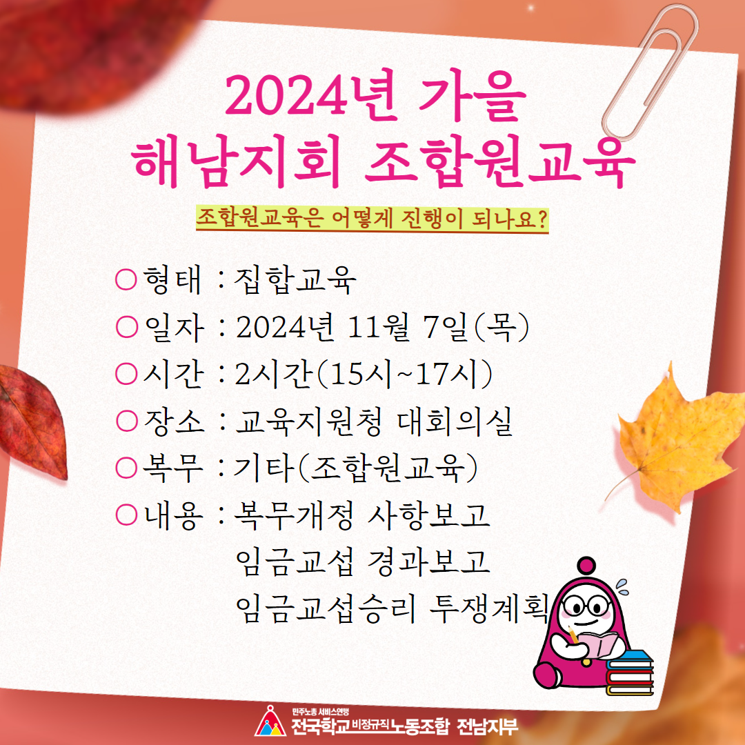 해남지회 조합원 교육 안내 작성자전국학비노조 전남지부|작성시간24.10.28|조회수47 목록 댓글 0 글자크기 작게가 글자크기 크게가 다음검색 현재 게시글 추가 기능 열기 북마크 공유하기 신고 센터로 신고 댓글 댓글 0 댓글쓰기 답글쓰기 댓글 리스트