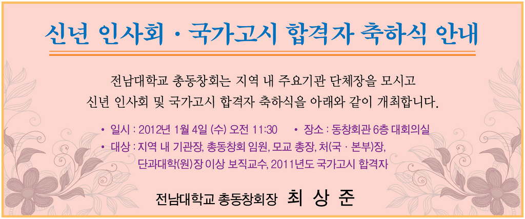 신년 인사회 · 국가고시 합격자 축하식 안내 작성자총동창회(사무처)|작성시간11.12.16|조회수49 목록 댓글 0 글자크기 작게가 글자크기 크게가 다음검색 현재 게시글 추가 기능 열기 북마크 공유하기 신고 센터로 신고 댓글 댓글 0 댓글쓰기 답글쓰기 댓글 리스트