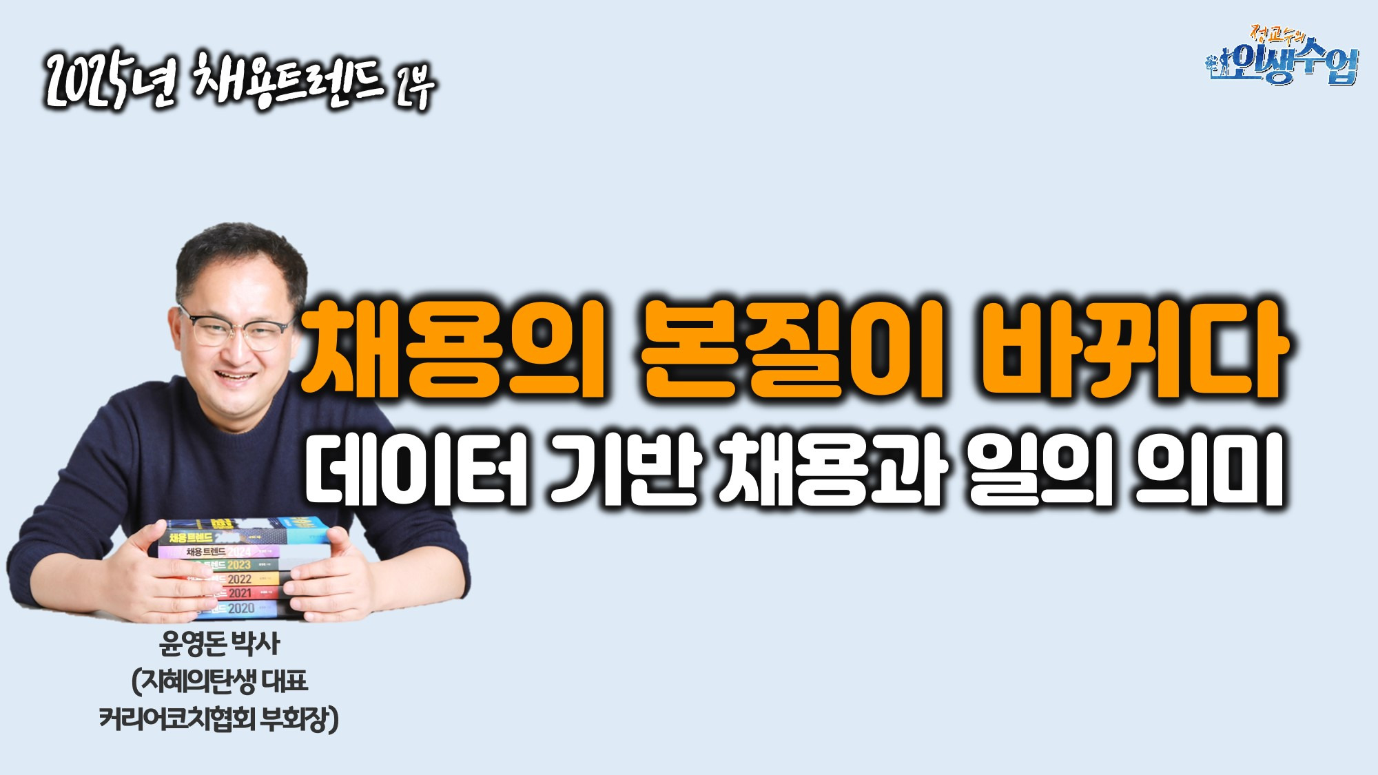 이번 2부 영상에서는 『채용트렌드 2025』 저자 윤영돈 소장님(윤코치연구소)이 데이터가 바꾸는 HR의 패러다임과, ‘일’의 의미가 다시 정의되는 과정을 통찰력 있게 풀어줍니다.