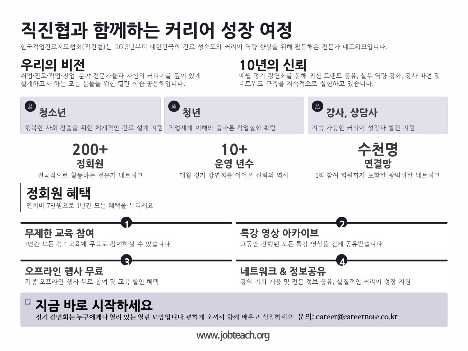 직진협은 취업·진로·직업·창업 분야에서 강의하거나 상담하는 전문가뿐 아니라, 자신의 커리어를 더욱 깊이 있게 설계하고자 하는 분들에게도 열린 학습 공동체입니다.