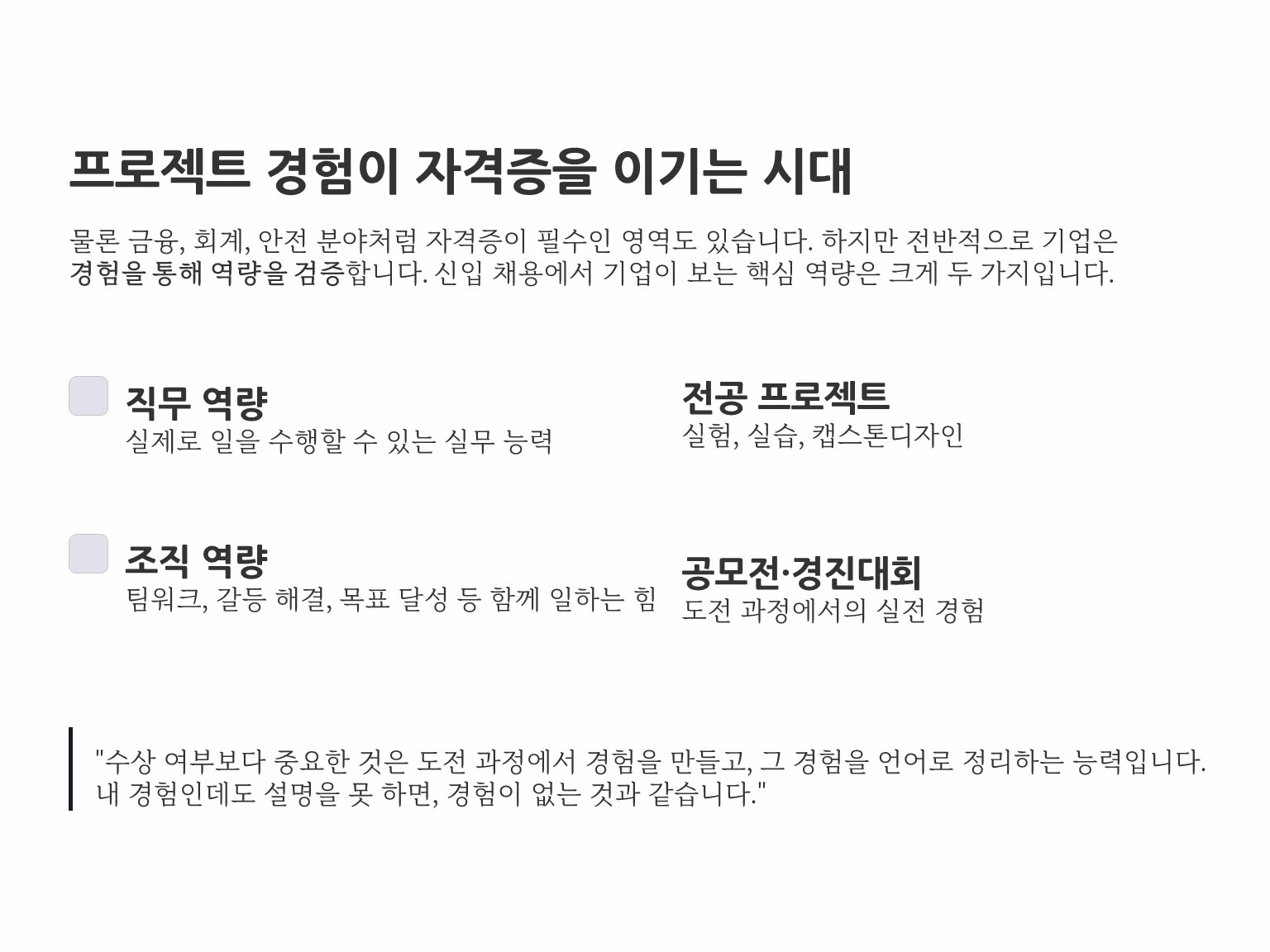 물론 금융·회계·안전처럼 자격증이 중요한 분야도 있지만, 전반적으로 기업은 경험을 통해 역량을 검증합니다. 여기서 강연자는 역량을 복잡하게 말하지 않습니다. 신입 채용에서 핵심은 크게 두 가지라고 정리합니다.