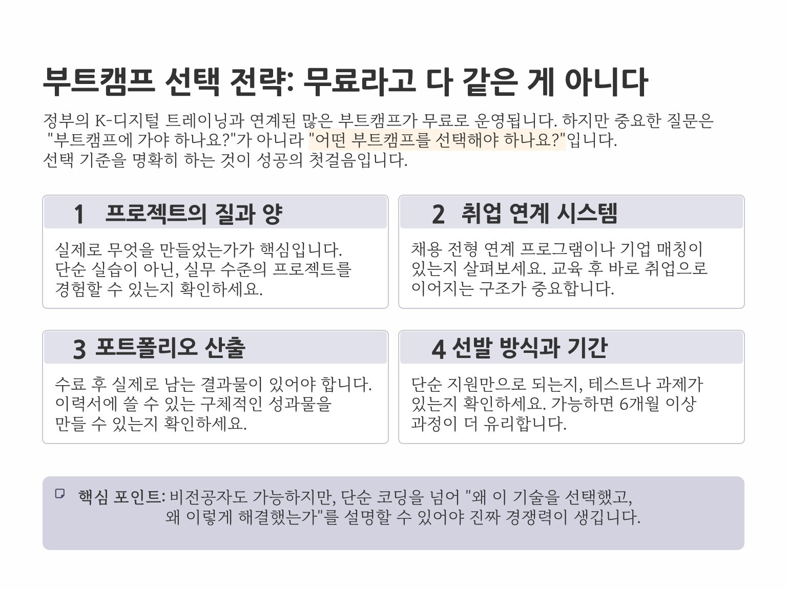 그렇다면 구직자 입장에서 중요한 건 “무조건 부트캠프 가야 하나요?”가 아니라, “어떤 부트캠프를 선택해야 하나요?”일 수 있습니다.