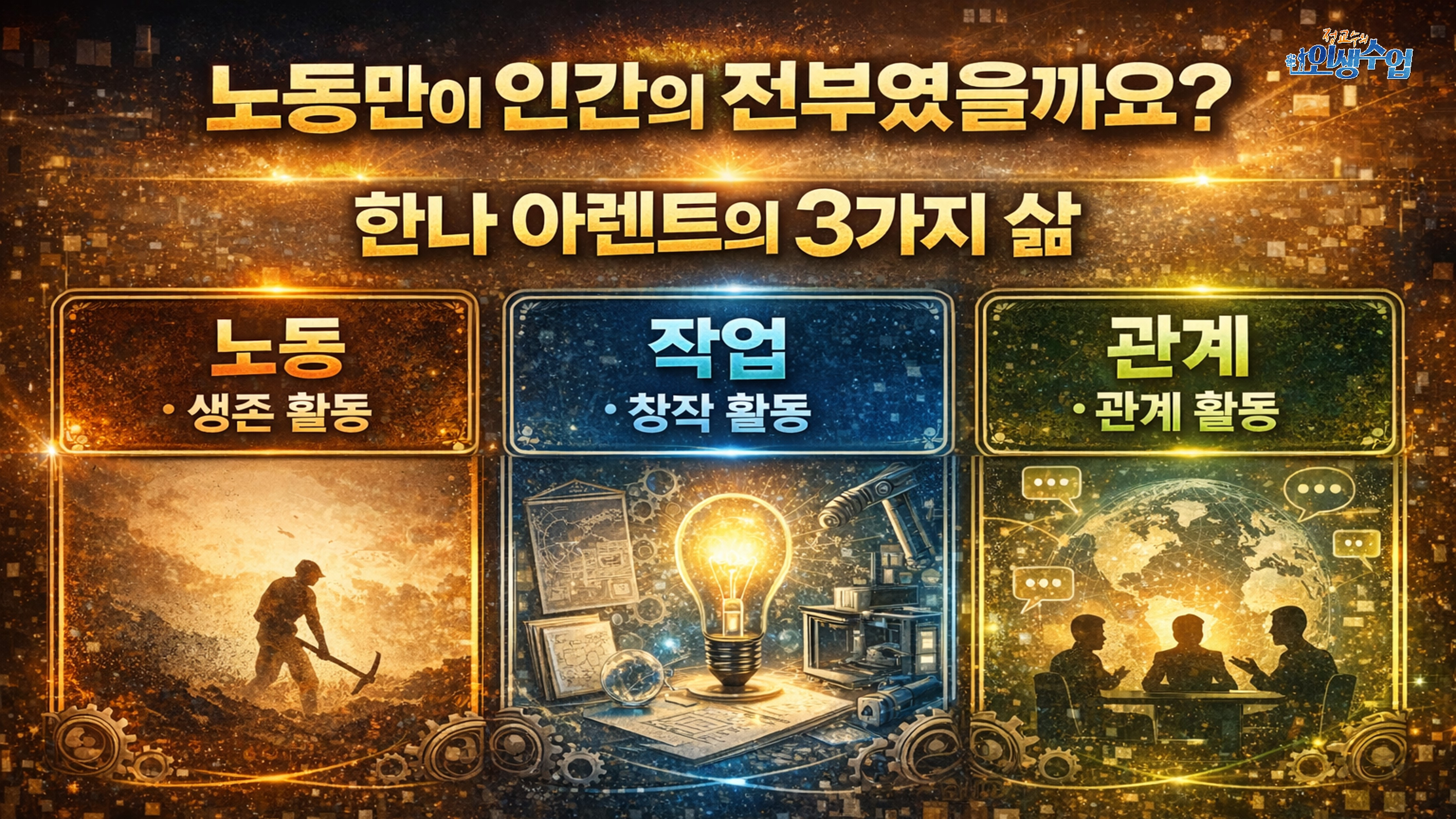 특강은 이 질문을 풀기 위해 한나 아렌트의 틀을 가져옵니다. 아렌트는 인간의 삶을 크게 세 가지로 구분합니다.
