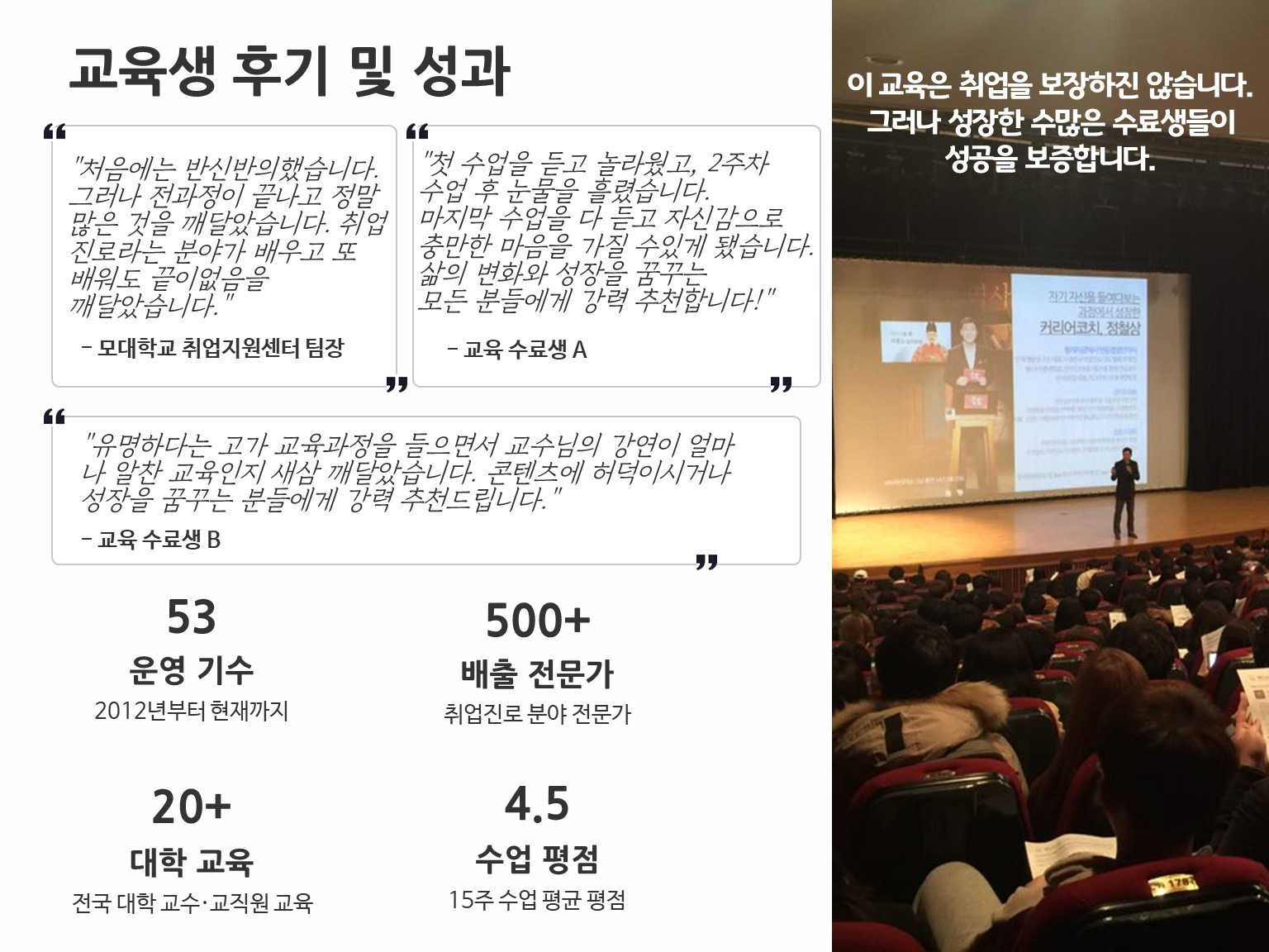 그러나 성장한 수많은 수료생들이 성공을 보증합니다.