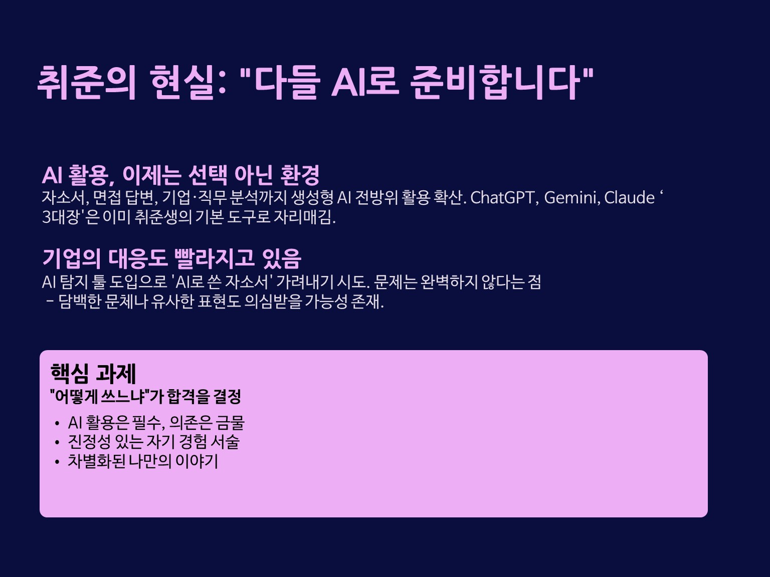 AI가 취업을 바꾸고 있는 것은 사실이지만, 결국 합격을 만드는 건 도구가 아니라 ‘나의 준비’입니다.