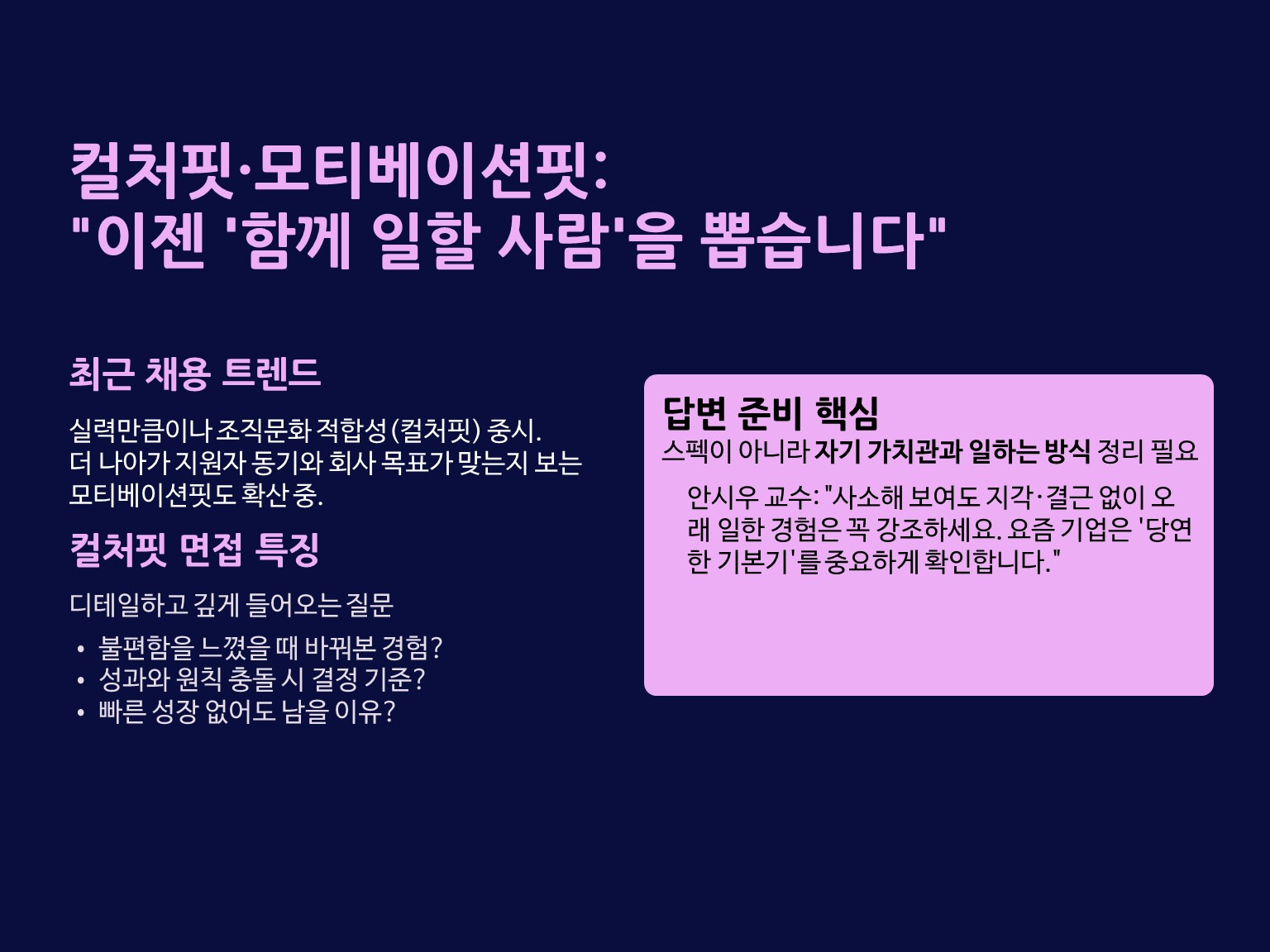 요즘 기업은 실력만큼이나 조직문화 적합성(컬처핏)을 봅니다. 그리고 한 걸음 더 나아가, 지원자의 동기와 회사 목표가 맞는지 보는 모티베이션핏도 확산되고 있습니다.