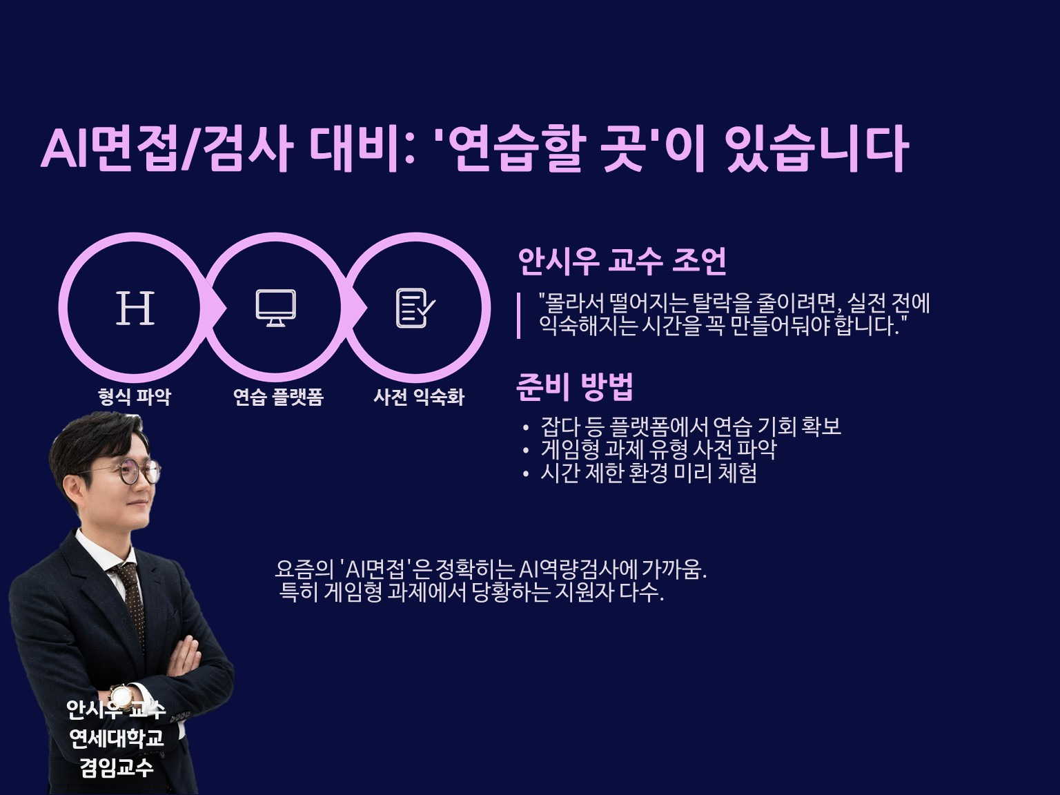 요즘의 ‘AI면접’은 정확히 말하면 AI역량검사에 가깝다고 안시우 교수는 말합니다. 특히 게임형 과제에서 당황하시는 분들이 많은데요. 안교수님은 잡다 같은 플랫폼에서 연습 기회를 확보하는 방법을 안내합니다.