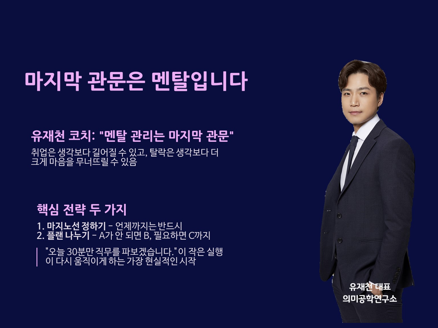 취업은 생각보다 길어질 수 있고, 탈락은 생각보다 더 크게 마음을 무너뜨릴 수 있습니다. 유재천 코치님은 멘탈 관리를 “마지막 관문”이라고 강조합니다.