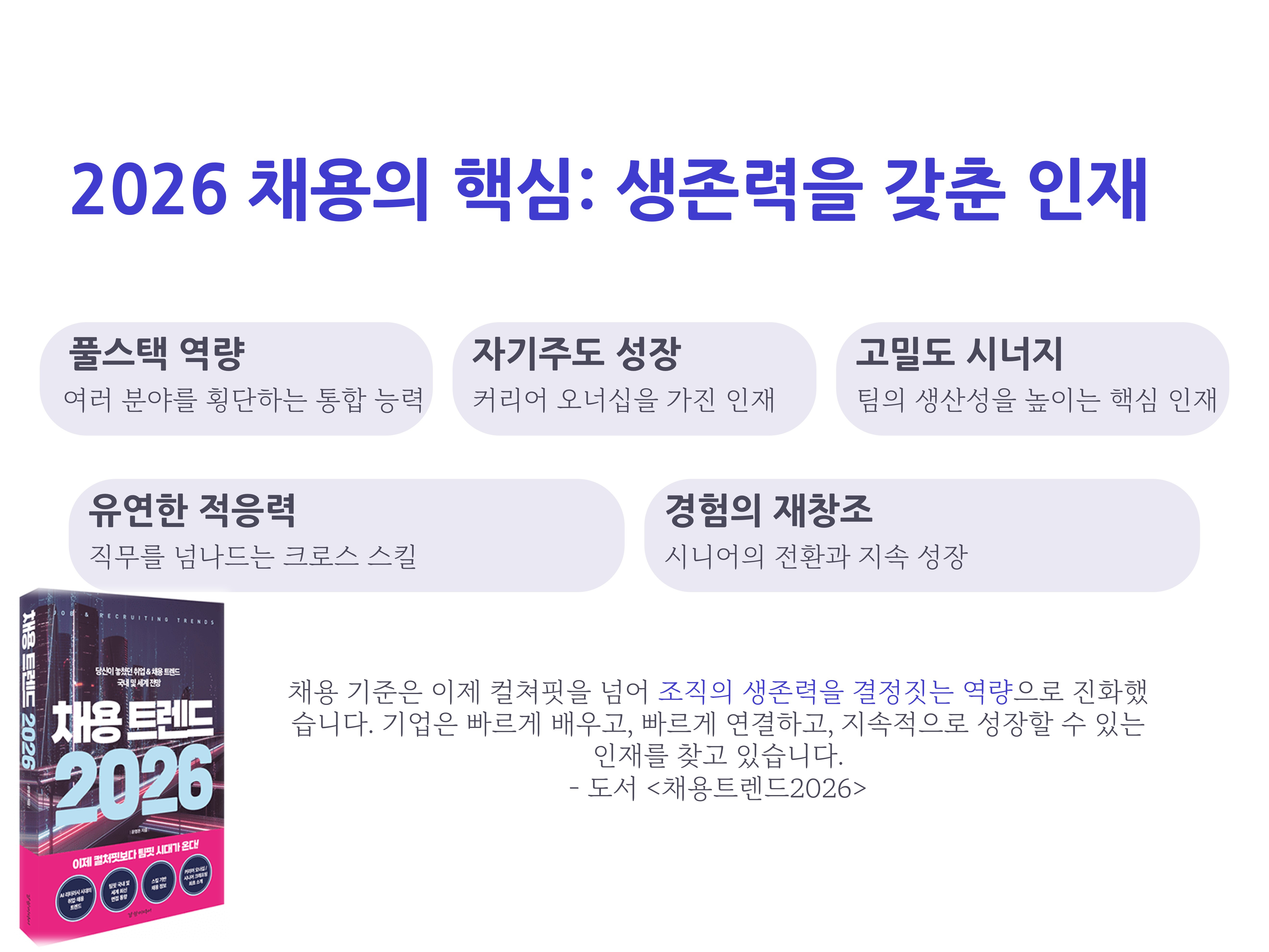 따라서 2026년의 채용은 ‘얼마나 회사에 맞는가’ 뿐만 아니라 “얼마나 스스로 성장할 수 있는 인재인가”를 동시에 묻습니다.
