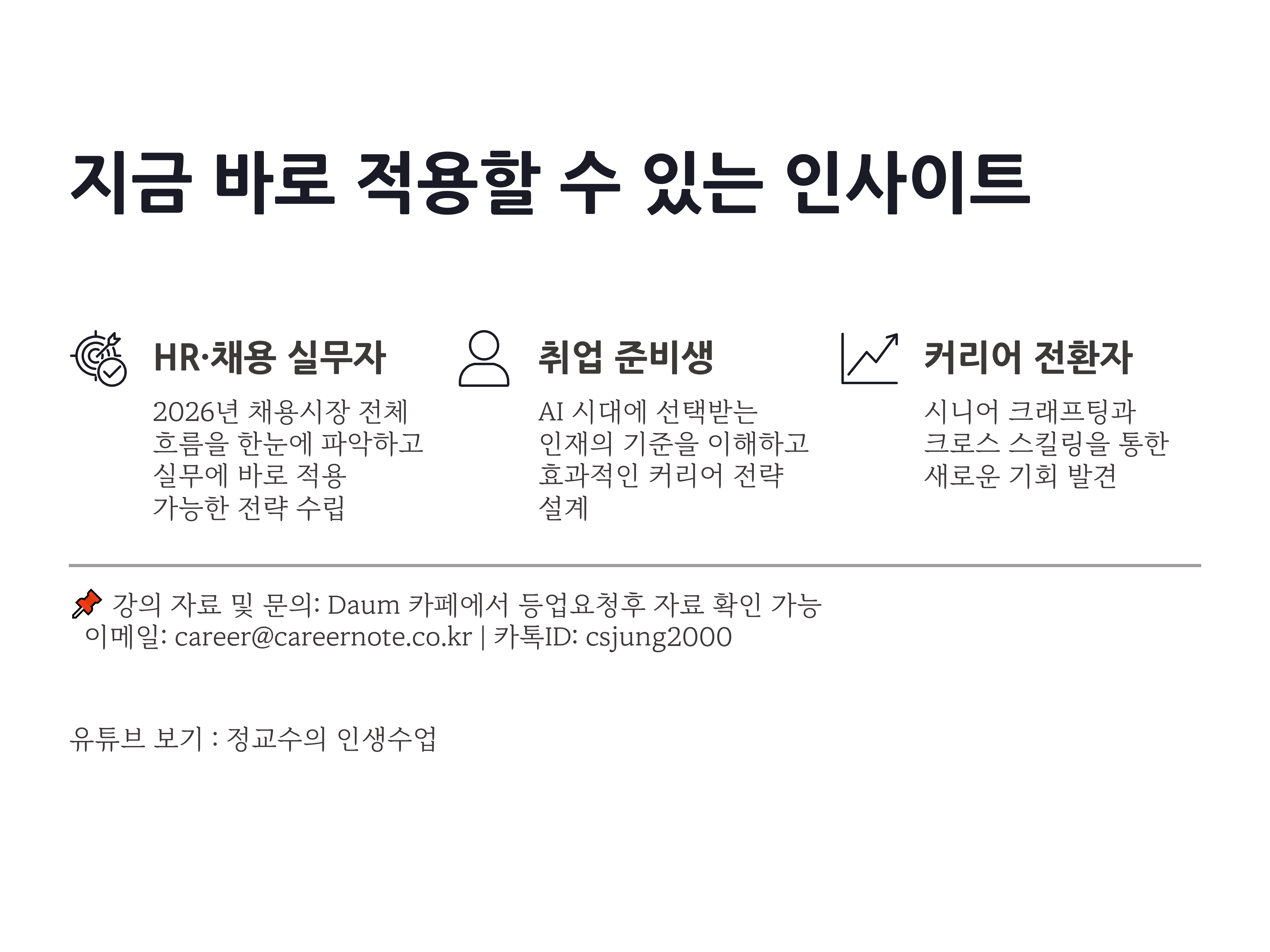 * 더불어 취준생과 취업분야 관계자분들을 위한 <취업트렌드 2026> 온라인 특강이 진행되고 있으니 관심 있는 분들의 적극적인 참여 권합니다.