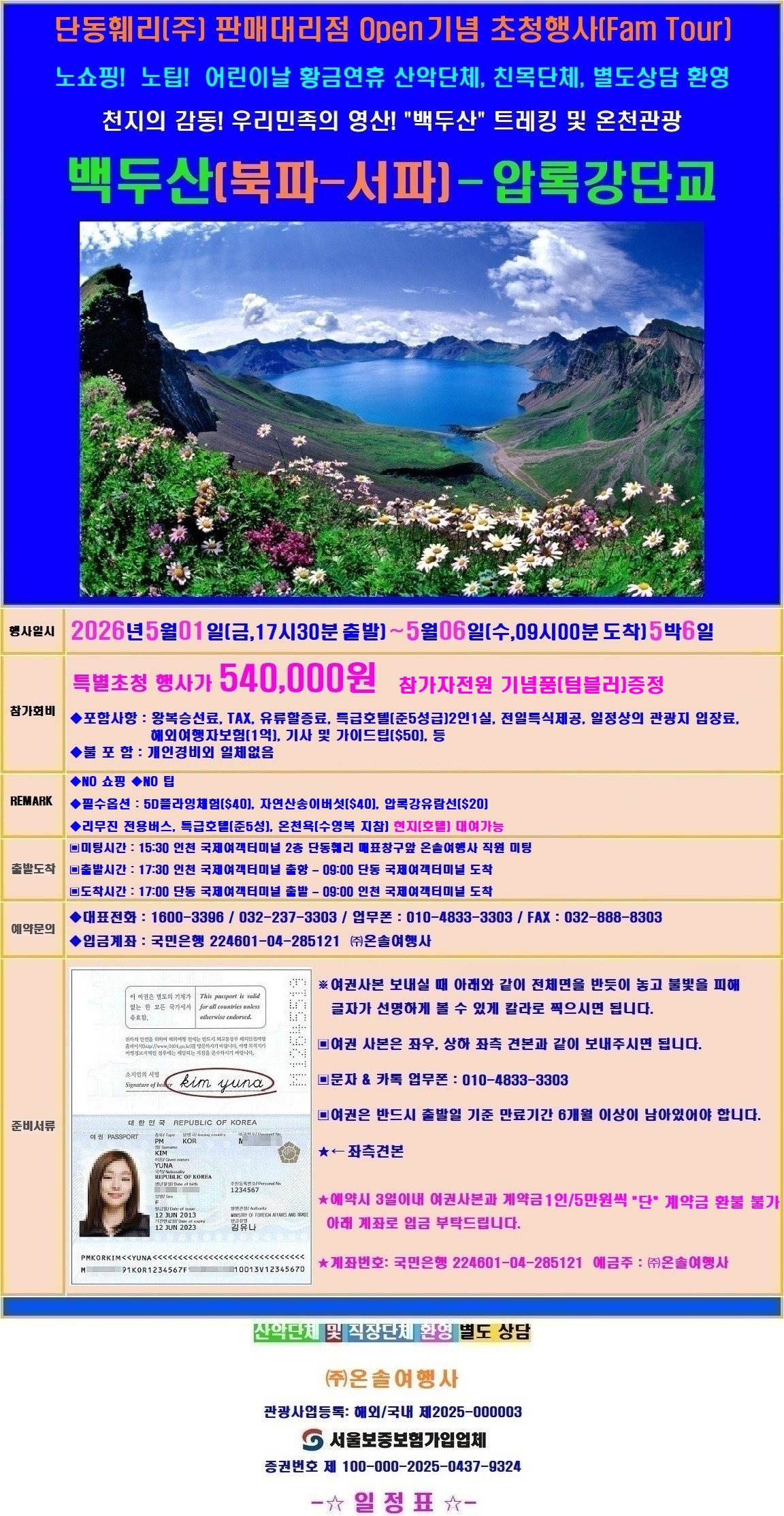 작성자온솔 작성자 본인 여부 작성자 작성시간 26.04.16 백두산(북파-서파) Internet off-line 선착순 예약으로 1~5호차 마감하며,