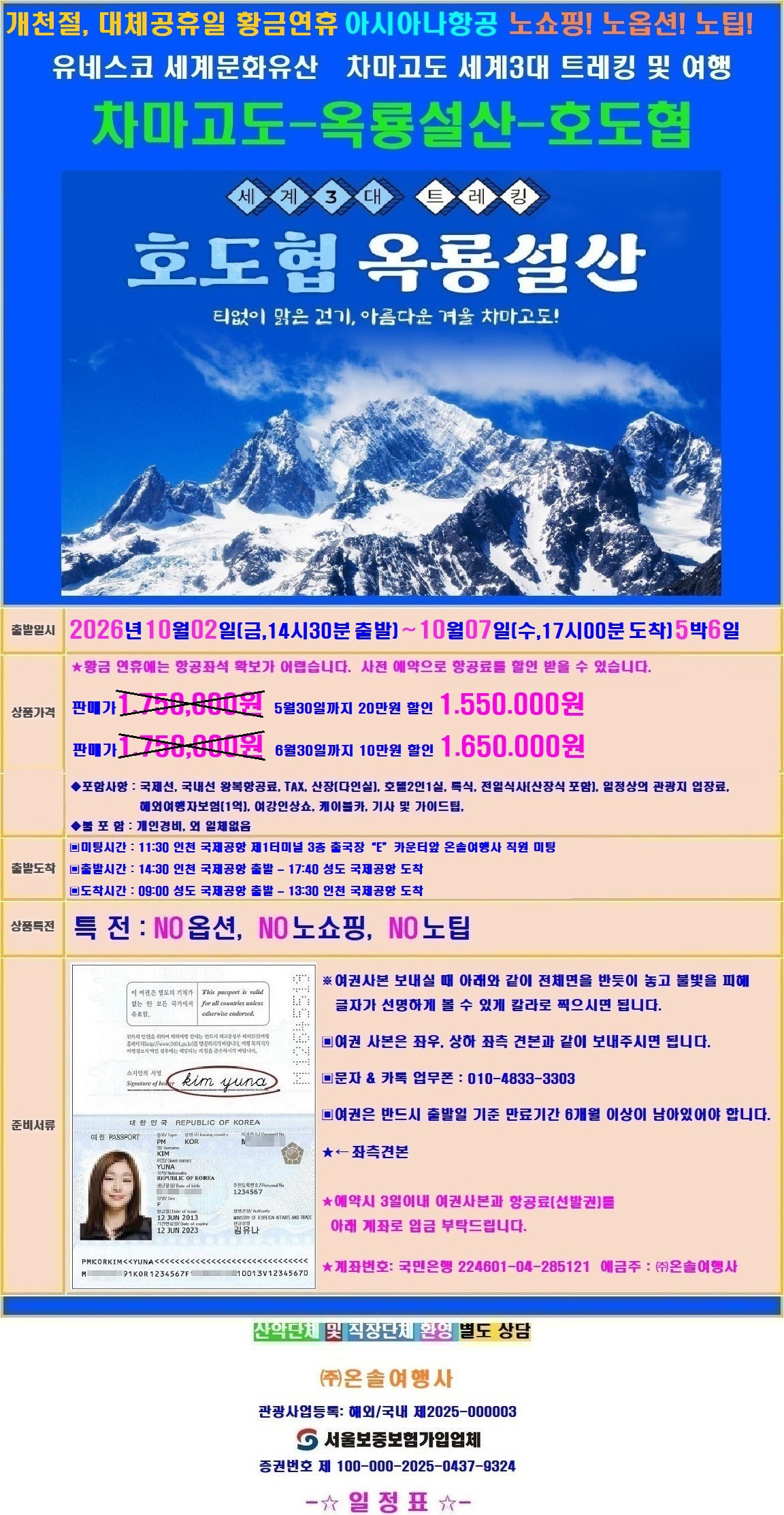 황금연휴 세계3대 트레킹 차마고도-옥룡설산-호도협 2026년10월02일(금,14시30분) ~ 07일(수,13시30분)5박6일 작성자온솔|작성시간26.04.26|조회수45 목록 댓글 0 글자크기 작게가 글자크기 크게가 다음검색 현재 게시글 추가 기능 열기 북마크 공유하기 신고 센터로 신고 댓글 댓글 0 댓글쓰기 답글쓰기 댓글 리스트