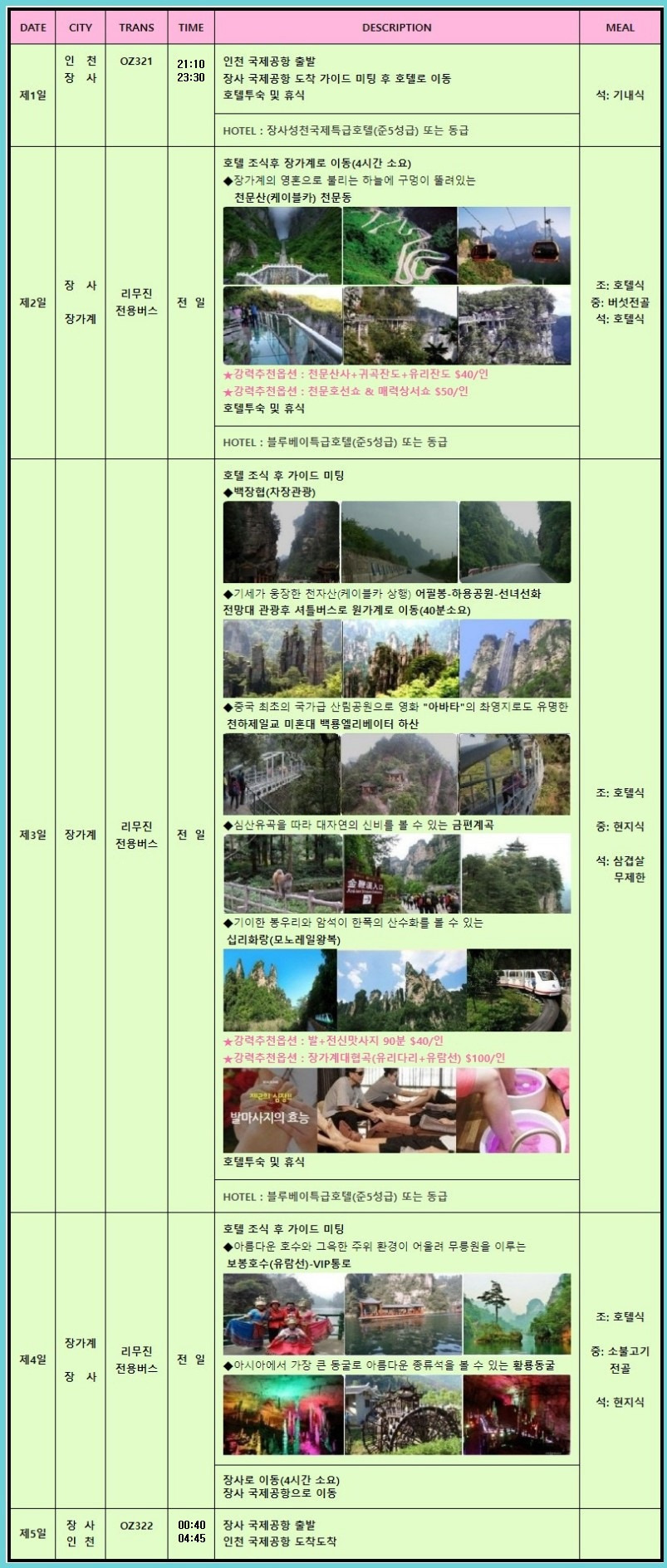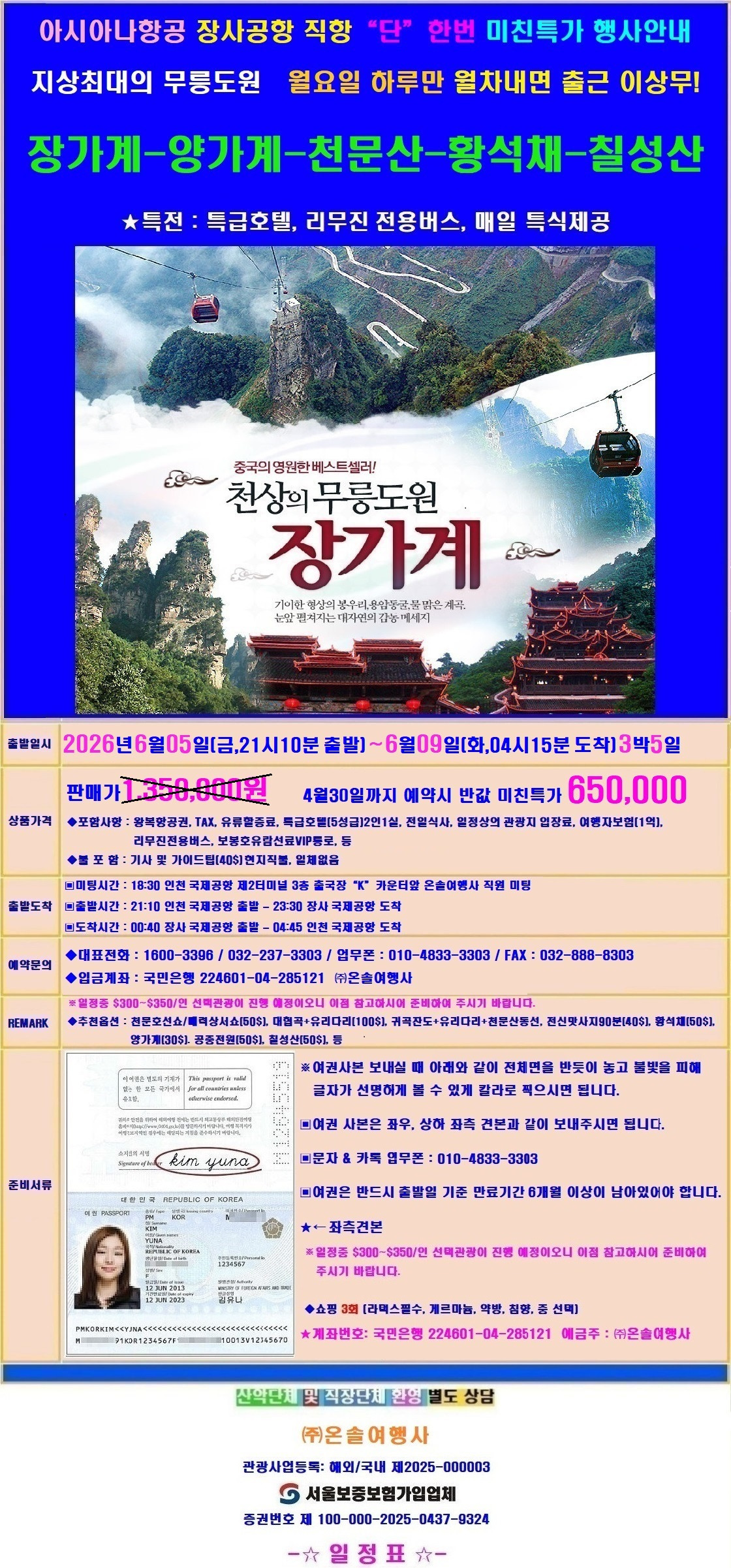 미친특가(650.000원) 장사공항 직항(아시아나항공) 장가계 6월05일(금,21시10분) ~ 09일(화,04시15분)3박5일 작성자온솔|작성시간26.04.11|조회수224 목록 댓글 0 글자크기 작게가 글자크기 크게가 다음검색 현재 게시글 추가 기능 열기 북마크 공유하기 신고 센터로 신고 댓글 댓글 0 댓글쓰기 답글쓰기 댓글 리스트
