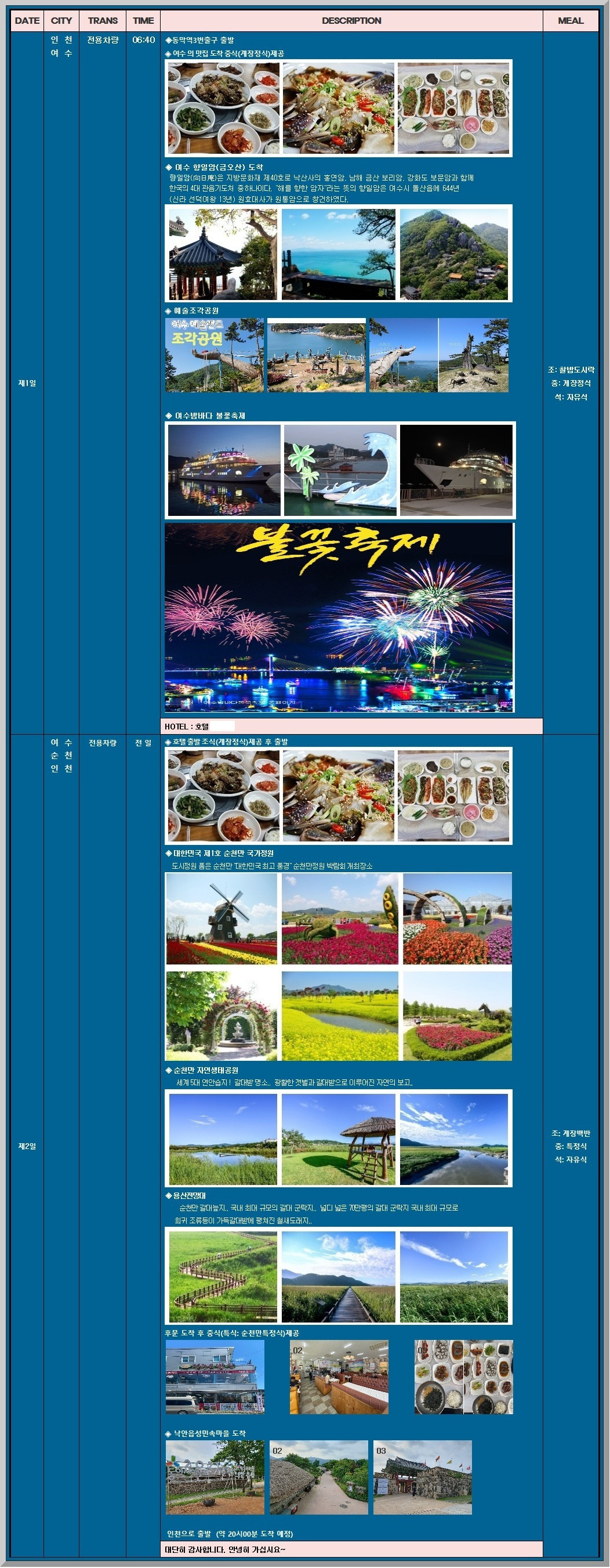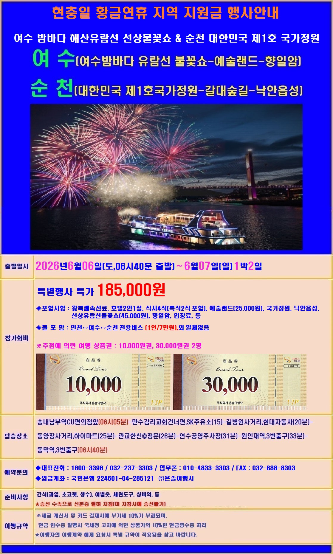 현충일 황금연휴 6월06일(토,06시40분) ~ 07일(일)1박2일 여수 - 순천(명소관광) 및 유람선 불꽃쇼 & 순천국가정원 작성자조은산|작성시간26.04.26|조회수52 목록 댓글 0 글자크기 작게가 글자크기 크게가 다음검색 현재 게시글 추가 기능 열기 북마크 공유하기 신고 센터로 신고 댓글 댓글 0 댓글쓰기 답글쓰기 댓글 리스트