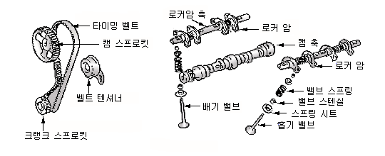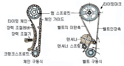 크랭크축이 회전을 하면 크랭크 스프로킷으로부터 캠 스프로킷에 연결된 타이밍벨트가 회전하여 캠축을 회전시킨다.(크랭크축 2회전시 캠축은 1회전한다)