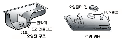 이것은 엔진 오일을 저장하기 쉽도록 한 섬프(일부를 더 깊게 만든 부분)와 섬프 아래 부분에는 오일을 배출시킬 수 있는 드레인 플러그가 있다.