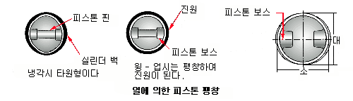 피스톤 스커트부는 피스톤의 왕복운동을 할 때 가이드 역할을 하며, 보스 부분은 피스톤 핀이 장착되는 부분으로 냉각시는 타원형이나 웜업시는 팽창하여 진원으로 된다.
