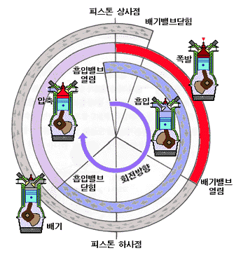 배기밸브는 하사점 약 50도전 위치에서 열기 시작하고 피스톤 상사점 후에 닫히게 된다.