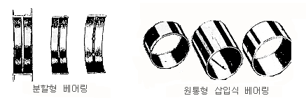 크랭크 축의 저널 부분이나 크랭크 핀 부분에 사용하는 베어링은 일반적으로 분할형을 쓰고, 캠 축 저널 부분 및 카운터 밸런스 샤프트의 베어링은 원통형의 삽입식 미끄럼형 베어링을 사용한다.