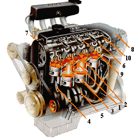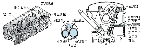 1. 밸브 2. 밸브스프링 3. 피스톤 4. 커넥팅로드 5. 크랭크축 6. 캠축 7. 캠스트로킷 8. 로커커버 9. 로커암 축 10. 로커암